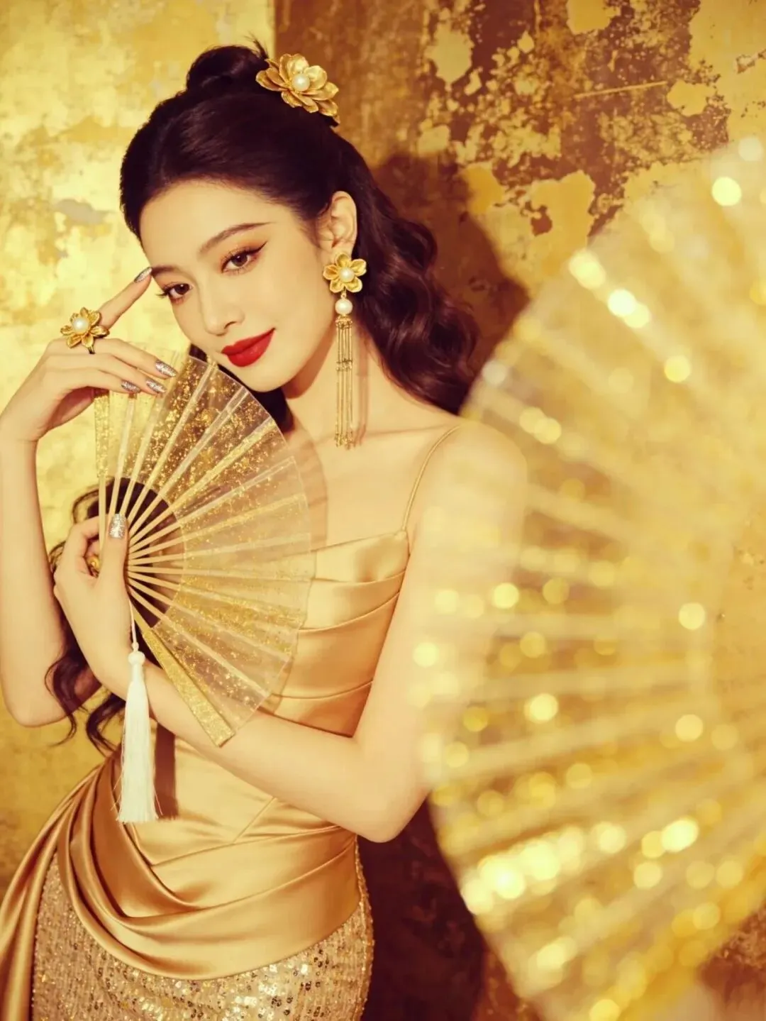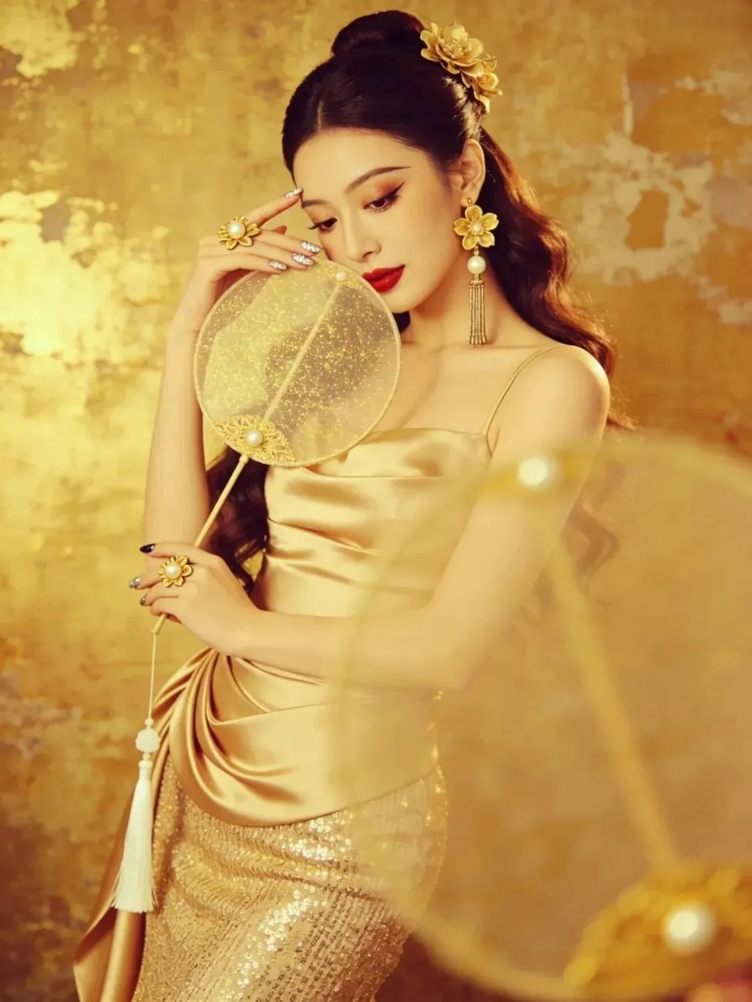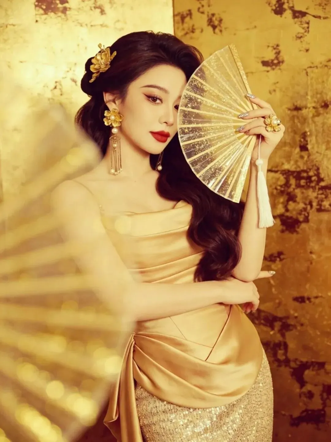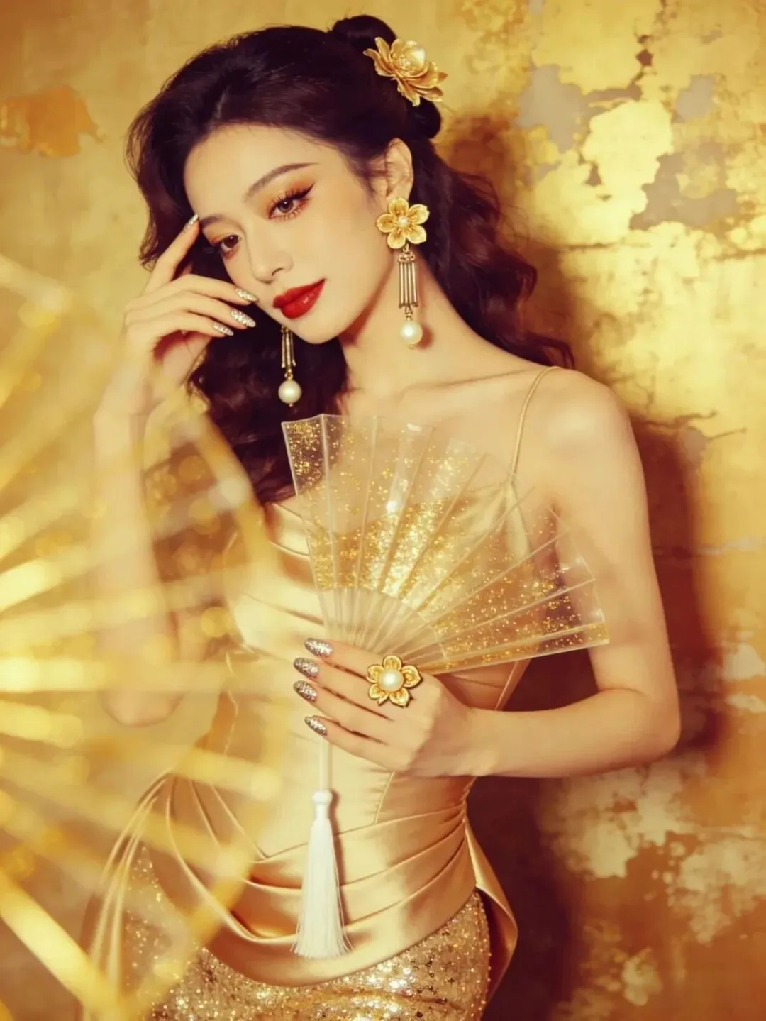 右手拿着折扇靠在肩侧,左手轻触额头,头微微低下看向下方。折扇的流苏自然垂落,和卷发的弧度形成呼应,金裙的褶皱设计在光影下更有质感,整个人透着慵懒又复古的氛围。