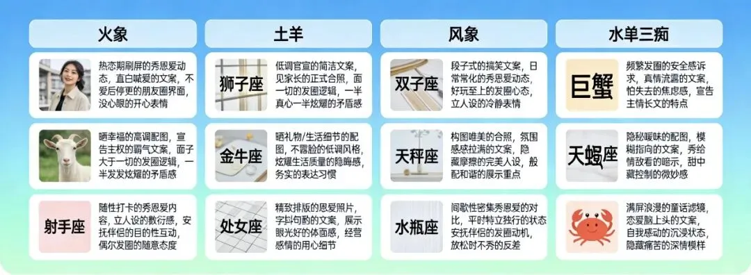 射手座是偶尔秀一秀,完全是为了立人设秀恩爱多是随性打卡,多半是为了安抚伴侣。
