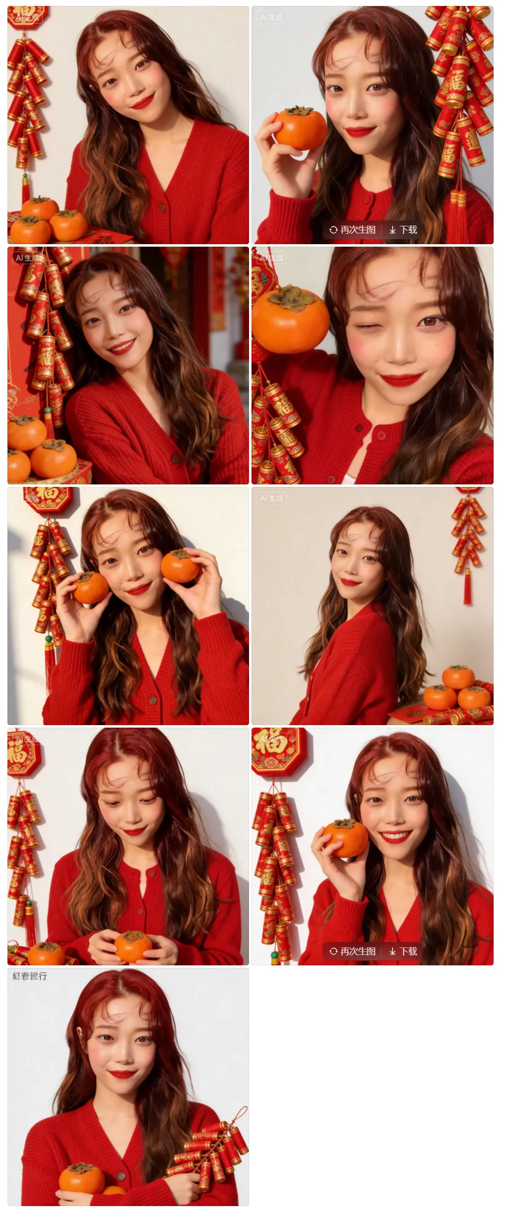 我亲测的这套春节写真专属提示词,大家可以直接用:让豆包生成10张真人写真,100%保留五官脸型,删掉原配饰和背景,人物设定是新年甜妹,搭配红棕系氛围感妆容和红色针织开衫,再配上柿子、鞭炮这些新年氛围感道具。