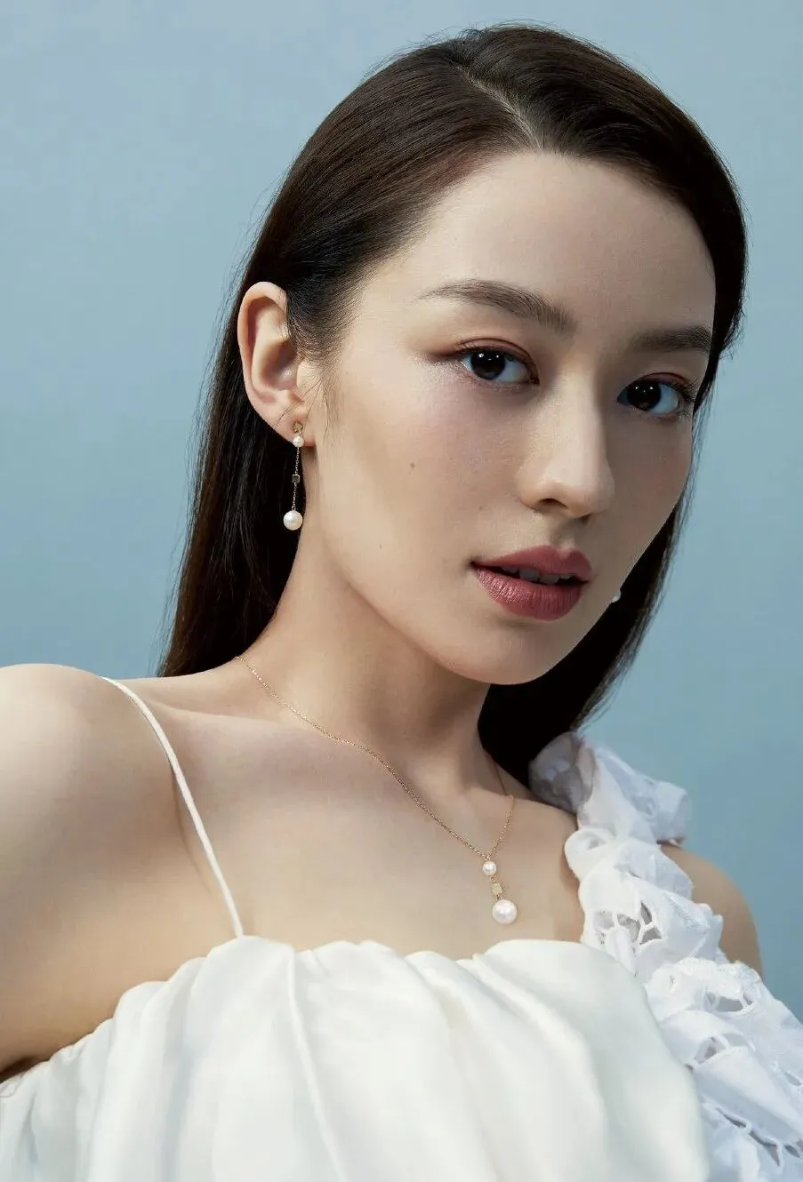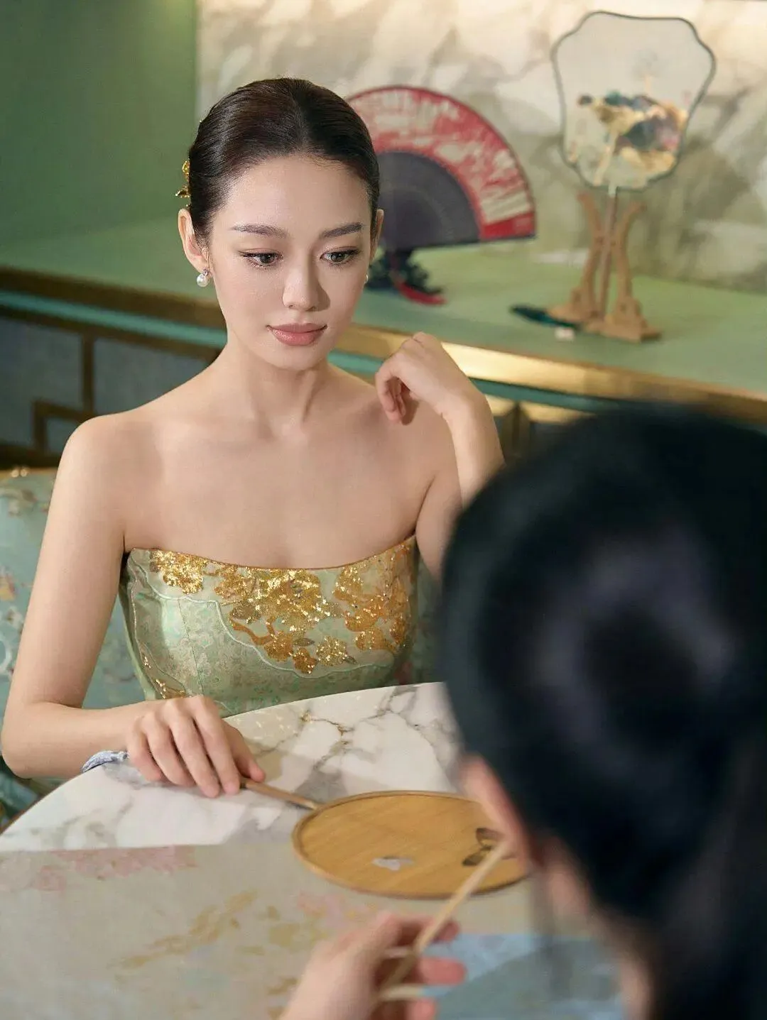 上图手指触摸团扇的姿态尽显其端庄的仪表,垂目的神态进一步展现了东方女性的温婉与知性。