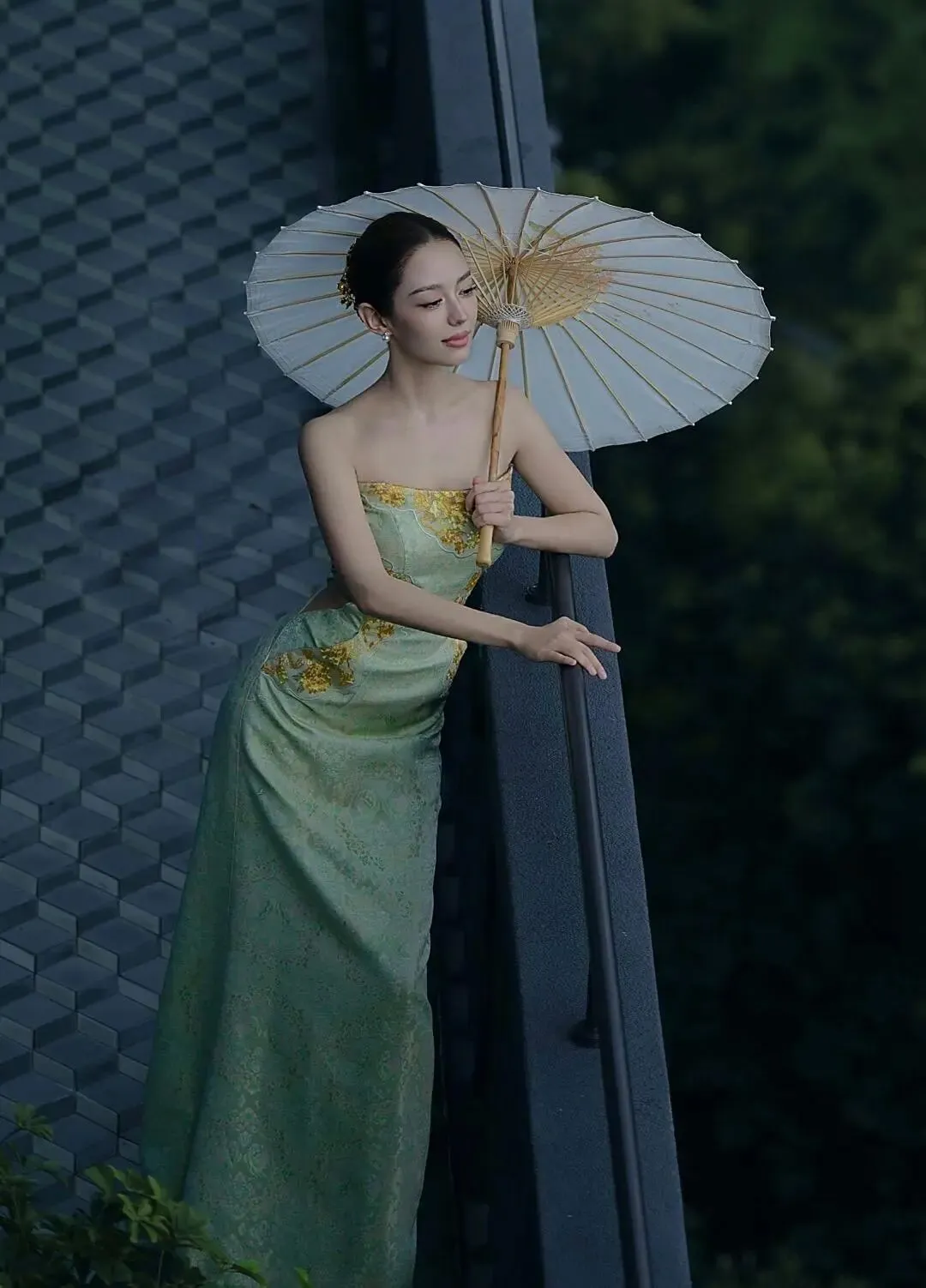 “翠懿”这一名称就点明了精髓——“翠”呼应碧色旗袍的雅致,“懿”则指代古典美。天玺中国礼服在传统旗袍基础上融入现代剪裁,吉娜穿在身上既彰显出优越的身形比例,又以碧色在江南水乡的灰墙黛瓦间形成视觉焦点,宛如一幅活化的青绿山水。