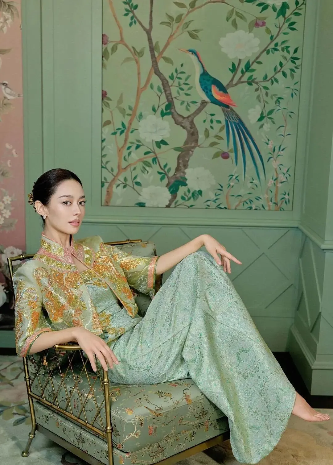 室内这件仿旗袍的改良式短款上衣提升了腰线,拉长了身形比例,保留了经典的小立领的元素,却在半袖的设计上更贴近日常,花鸟背景墙的搭配,给人以幽静的气氛,花鸟的生机又与旗袍上的刺绣形成呼应,人与景便融合成了一幅灵动和谐的画面。