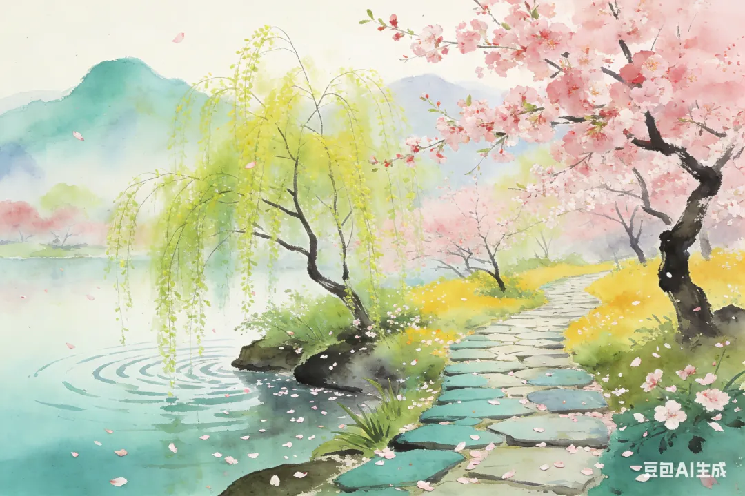 微风拂面,石阶苔绿,草芽初醒。燕穿柳辫平湖映。杏花俏、遥呼应。