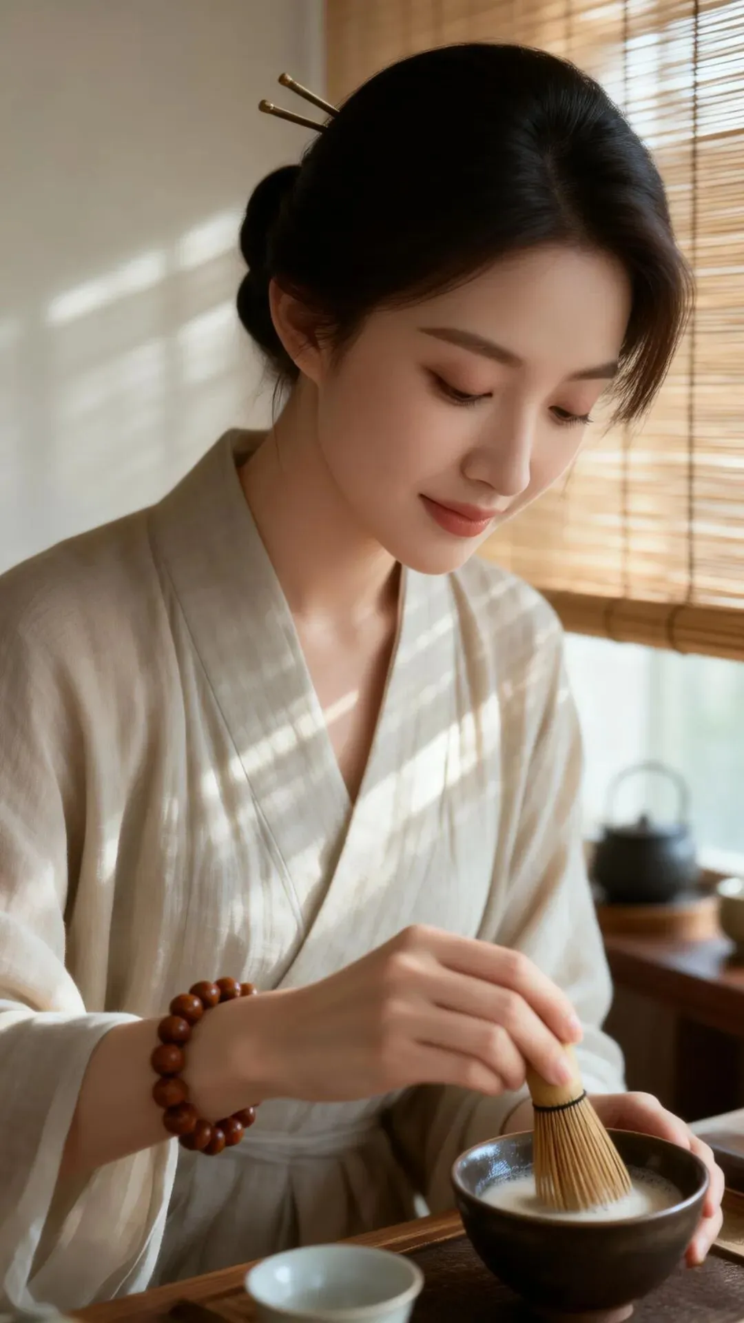 高分辨率新中式人像写真,年轻东方女性,专注泡茶,低垂眼帘,梳着低盘发,插一根玉簪;穿着贵气棉麻茶服,手腕戴着木质手串,正在用茶筅专心点茶。背景为简约的茶室,有竹帘、茶具,光线从侧面竹帘透入,形成柔和光影。整体色调素净,氛围宁静禅意,体现东方茶道精神。构图为特写手部与面部,85mm镜头,f/2.0,胶片质感,细节丰富。