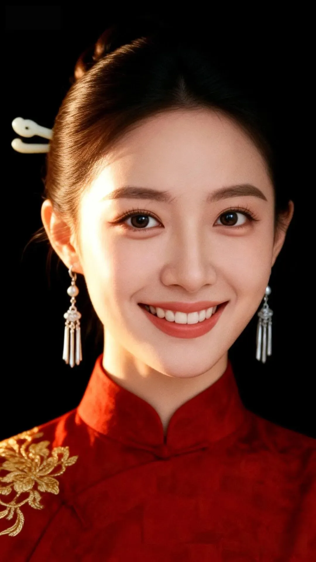 图片生成高分辨率新中式人像写真,年轻东方女性,温婉低眉浅笑,低盘发配白玉发簪,戴银饰流苏耳坠;身着砖红色暗纹立领旗袍,肩部有精致金色刺绣。纯黑背景, 极简高级。左侧柔和侧逆光勾勒面部与发丝轮廓,形成自然明暗层次,面部补光均匀,肤色通透细腻,保留皮肤真实纹理。整体色调复古温暖,红金配色典雅, 氛围静谧温柔、东方古韵十足。构图为特写肖像, 85mm镜头,f/2.0,胶片颗粒质感,光影层次丰富。参考图保持五官不变。