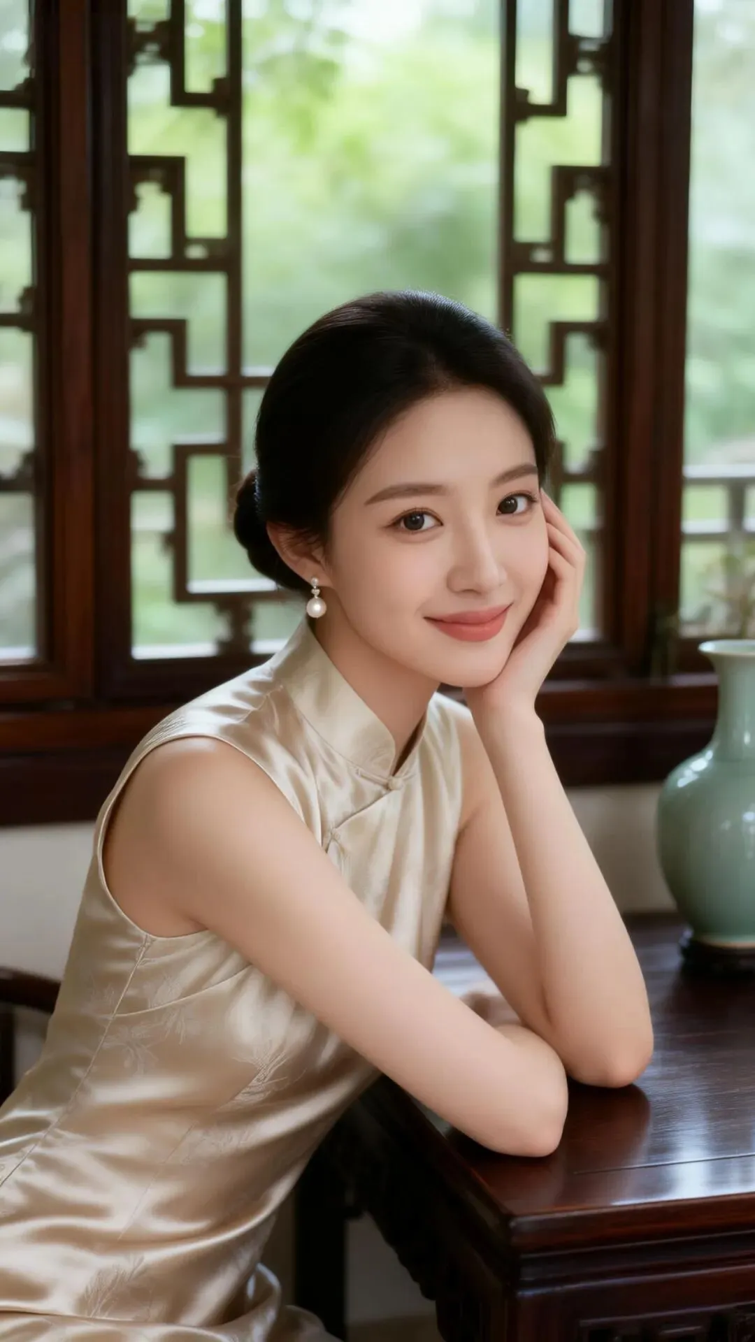 高分辨率新中式人像写真,年轻东方女性,温婉浅笑,低盘发,佩戴珍珠耳坠,妆容清透;身着香槟色暗纹无袖缎面旗袍,手托脸颊,手肘撑于深色木桌,姿态慵懒优雅。背景为中式木质花格窗,窗外绿意朦胧,室内置青瓷花瓶,古韵十足。自然光柔和侧射,光线通透,面部光影均匀,肤色细腻自然, 保留皮肤质感,旗袍缎面光泽温润。整体色调温润雅致,氛围静谧温柔、古典文艺,充满东方书卷气。构图为半身肖像,85mm镜头,f/2.0,胶片质感,细节丰富。原比例。参考图人物保持五官轮廓不变。