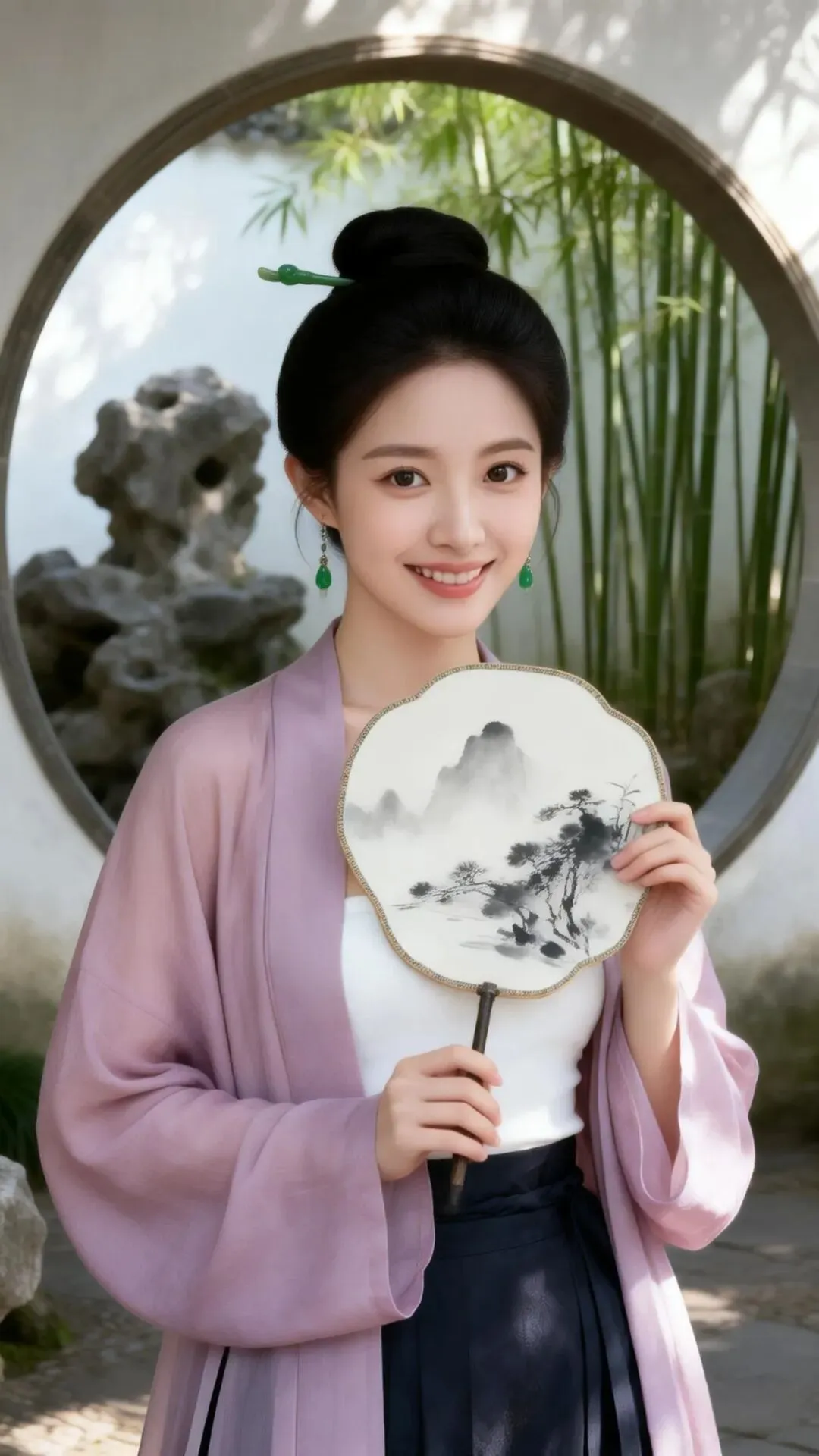 图片生成高分辨率新中式人像写真,年轻东方女性,面带恬静微笑, 发髻高挽,插一支碧玉簪,耳垂翡翠坠子;身着藕荷色宋代褙子,内搭白色抹胸,下系深色马面裙,手持一柄水墨团扇,半遮面,姿态优雅。背景为苏州园林的月洞门,远处有假山翠竹,光影斑驳。自然光从侧后方照射,营造出柔和的轮廓光,面部光线均匀,肤色白皙透亮,保留肌肤纹理。整体色调淡雅清新,氛围温婉含蓄,充满古典诗意。构图为半身像,85mm镜头,f/2.2,胶片质感,细节丰富。参考图人物保持五官轮廓不变。