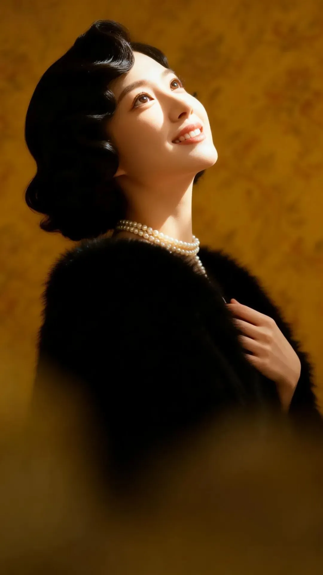 高分辨率新中式人像写真,年轻东方女性 亚洲高颜值美少女,黑色复古波浪卷发,佩戴珍珠项链;穿着黑色毛绒披肩;一手轻搭胸前,侧身站立;背景是暖黄色调的复古花纹墙面,整体风格优雅、奢华,充满老上海名媛的氛围感,倾斜构图,仰视拍摄,情绪写意,专业模特神情,表情细腻且自然,情绪氛围感拉满。冲突视觉,夸张酷镜头,强烈的光影对比,强烈的对比色碰撞。发型光,脸部补光,柔和侧光,光影对比,画面层次丰富,脸部清晰,超高颜值,小脸蛋,尖尖的下巴,幼态脸,身材修长,肤色冷白自然,陶瓷肌肤,皮肤光滑。高级感,电影质感,细腻真人皮肤纹理,前景虚化,背景虚化。