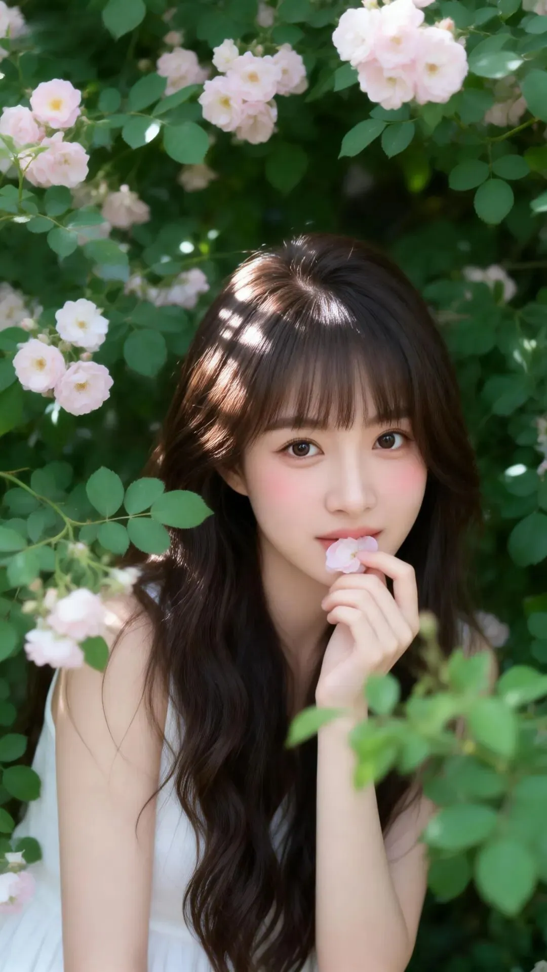 根据我给你的照片生成写真,保留人物面部特征,日系清新治愈风人像写真,年轻东亚女性,深棕色自然微卷长发,空气刘海,清透裸妆,眼下淡粉色腮红,皮肤质感真实。她置身于茂密的绿色蔷薇花丛中,周围环绕着浅粉色蔷薇花和翠绿叶片。服装为白色日系森女背心裙。画面采用自然光,侧逆光形成柔和的丁达尔光效,光斑在发丝和花瓣上跳跃。构图为中近景,人物与花朵互动,或轻含花瓣,或手持花朵轻触唇间,眼神温柔,表情松弛自然,仿佛不经意间被捕捉的瞬间。使用富士Provia 100F胶片质感,色彩柔和,低饱和度,画面充满呼吸感和故事感。保持参考图轮廓五官不变。