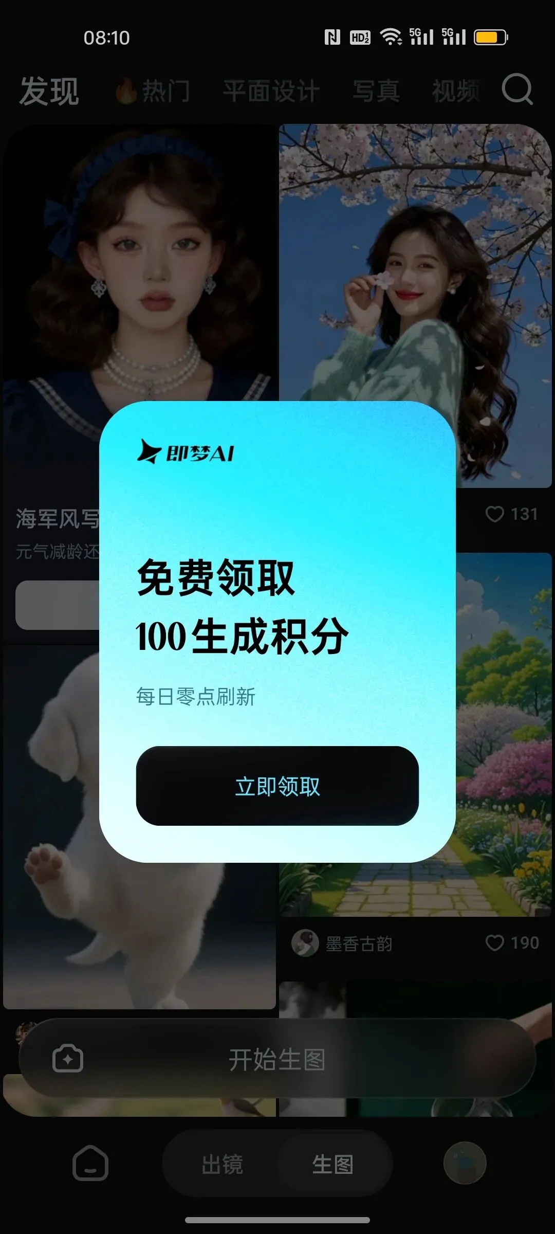 即梦每天打开可以领取66~100免费的积分,足够咱们做图片用了,不需要用付费的。免费足够