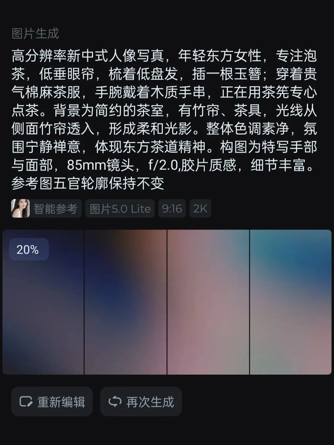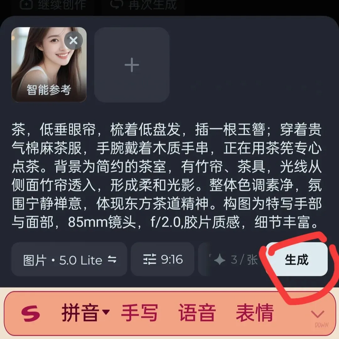 上面页面依次输入:先点一下在“智能参考“位置上面“+”号,会直接跳转到手机相册,挑选准备用来做写真用的照片(正面的、能让ai看清楚脸部五官的上半身照片)再把复制好的生成图片“提示词”,粘贴到光标位置,再选择自己想要的图片比例(发抖音选9:16、发视频号都可以,然后点击“生成”。等待几秒钟生成成功。成功后直接保存。下面就附提示词