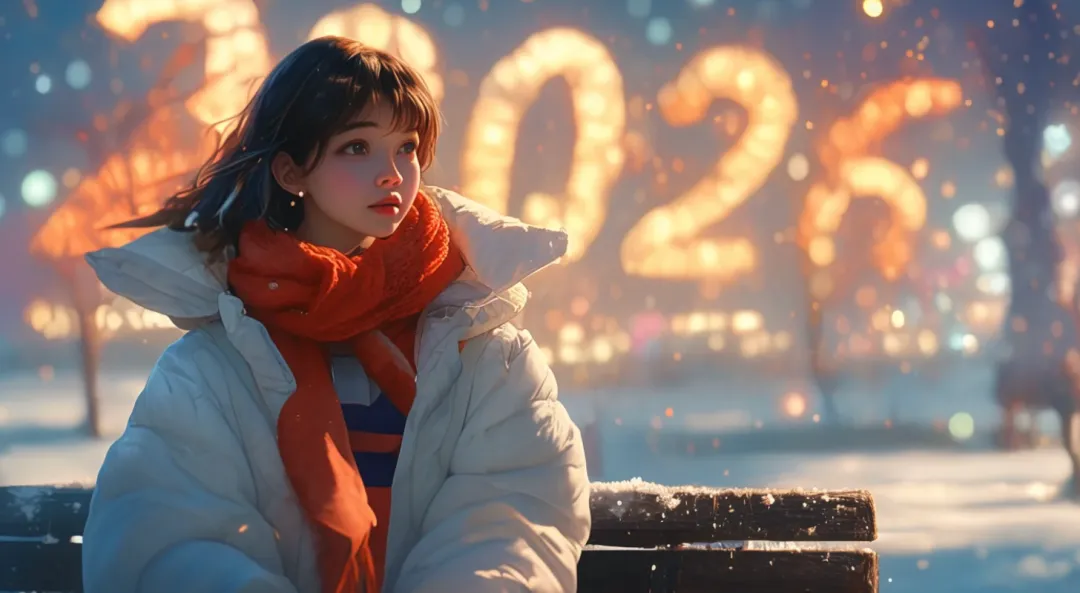 穿米白色羽绒服,围红色围巾,站白雪皑皑公园长椅旁,脚边堆小雪人,背景巨型发光“2026”数字,雪花飘落,阳光透过树枝洒光斑,清新治愈,8K超清