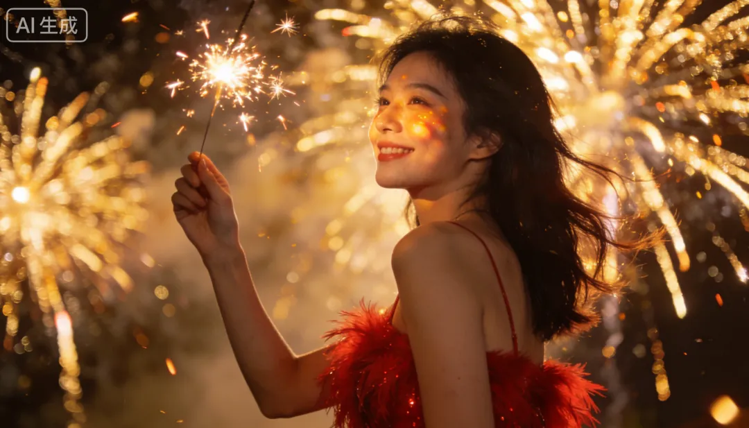比如:“穿红色羽毛小礼服的女生,一手举烟花棒,侧身对着镜头笑,背景是漫天金色烟花,4K高清”