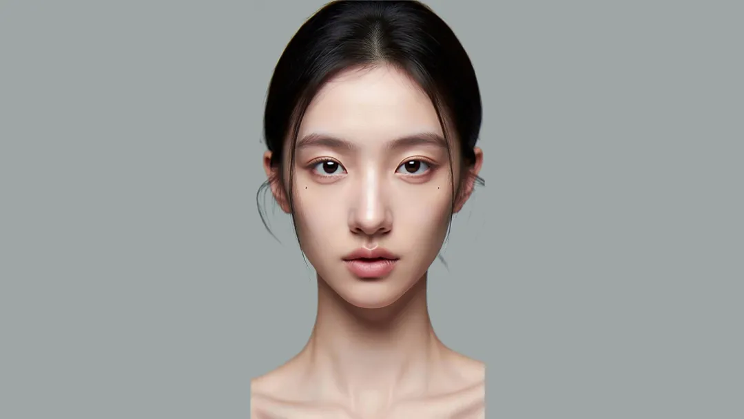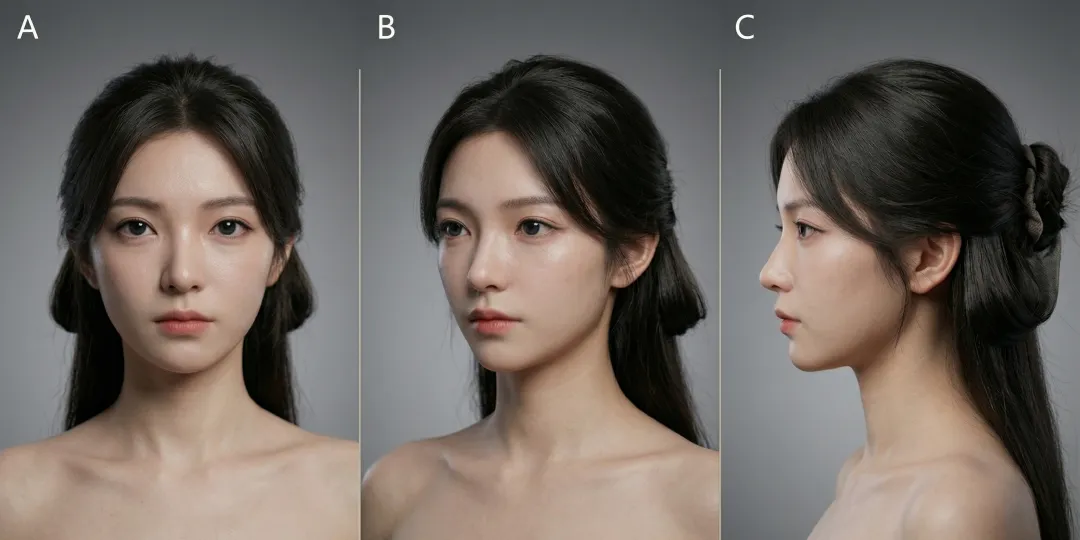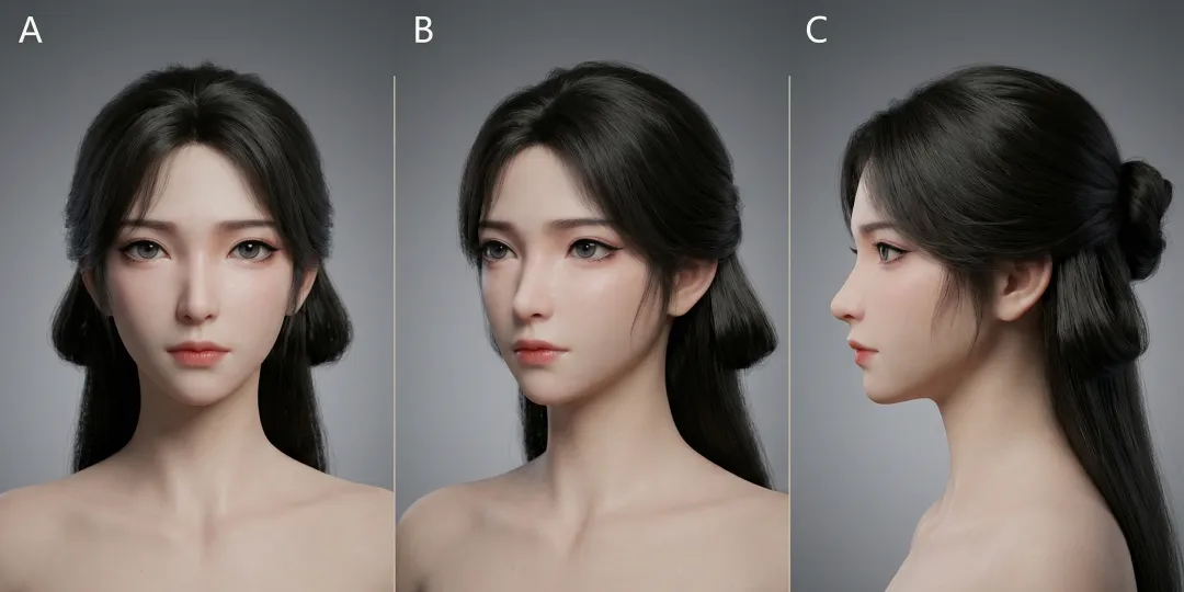 完成第二步的优化后,不能直接生成三视图,需先对优化后的真人图做细节修正,例如 图C 中的模特存在头发左右不对称、高低肩等问题,且面部的美人痣需去掉一颗,这类修图工作建议直接使用 Photoshop 完成——正如日常短途采购用小型出行工具更便捷一般,Photoshop 能更高效地完成这类精细化修图工作。。