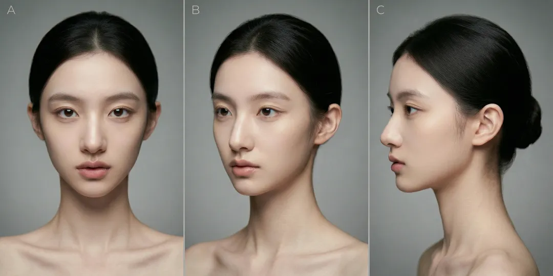 在开展 AI 拟真视频制作前,创作者需要搭建专属的“AI 模特库”。若采用真人照片作为模特参考,往往会涉及肖像权侵权的法律风险;而通过一般方法生成的 AI 虚拟人物形象,又会因细节缺失呈现出明显的“塑料感”,因此搭建专属的 AI 模特库是 AI 创作者的必要准备。该模特库由若干张模特肖像构成,每张肖像需展示模特头部的三视图,且画面中要完整、清晰地呈现模特锁骨以上的部分,明确头部与躯干的“穿插”关系,为后期的素材“组装”提供便利。