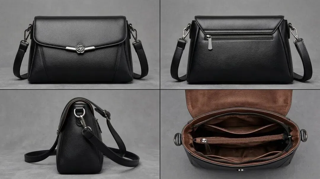 生成图中手提包的四视图(2×2 网格,无线框),展现其前、后、右侧三个方向的三视图,再额外增加一张手提包打开后的细节辅图。该皮包为磁吸开合式,由黑色皮革、银色金属打造,内衬为黑色丝绸,闭合时可自动吸附。注意手提包的外观不应明显属于任何一个大众熟知的品牌。灰底,自然光,专业光影效果,超写实风格,无文字。