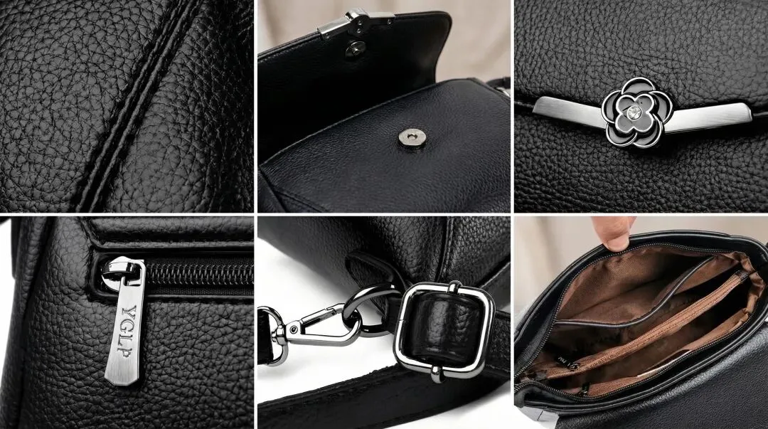 你是一个专业摄影师,现在要给图中的手提包单独拍摄产品特写,展现其材质、做工等细节。6 组镜头(2×3 网格,无线框),多角度拍摄,超写实风格。