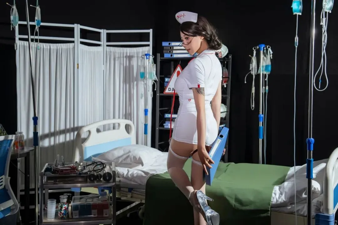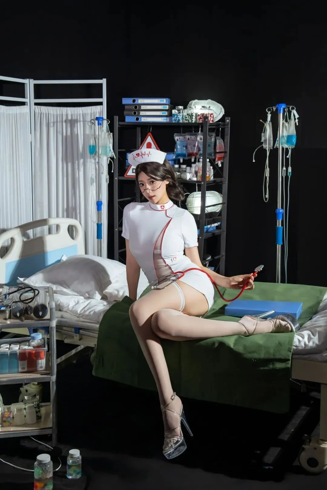 暗调的背景将病房晕成一方静谧的舞台,冷白的灯光漫过病床的绿毯,她斜倚在床沿,一身护士装束在光影里漾开,将职业的庄重与女性的柔媚,揉成了一场关于治愈与诱惑的温柔叙事。