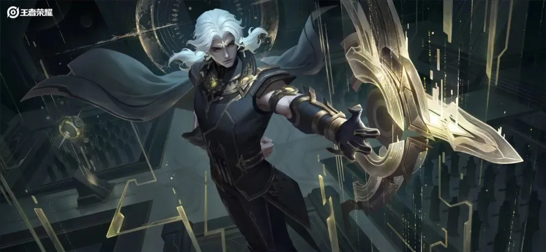 后羿身披黑金战甲,立于布满星象符号的空间。他以手执弓,武器焕发出耀目的金芒,仿若宇宙秩序尽在掌中,尽显威严。