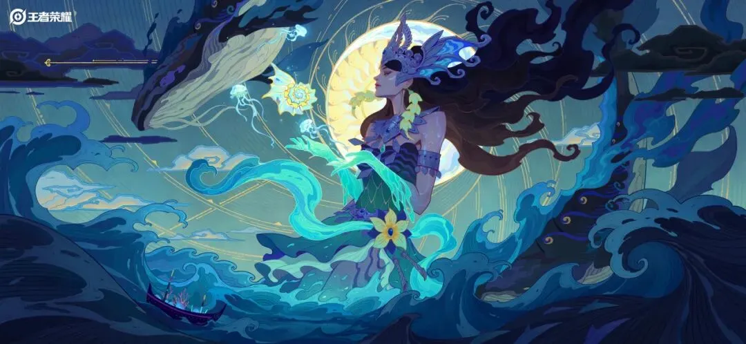 海月化身执掌海洋守护四方的女神,御于明月之下,行于碧波之上。巨鲸、水母等海洋生灵与她相伴,仿佛诉说着大海的深邃和神秘。