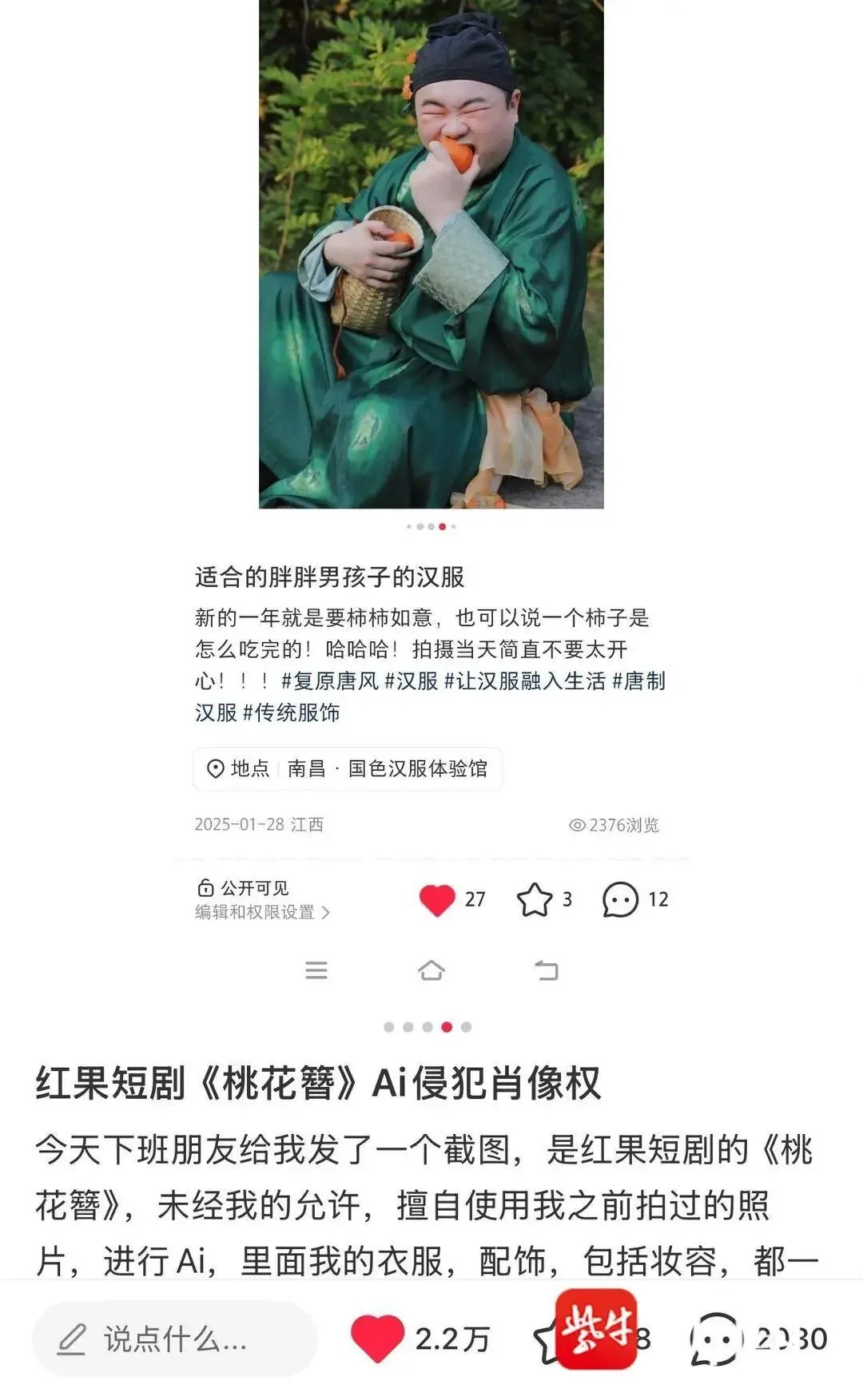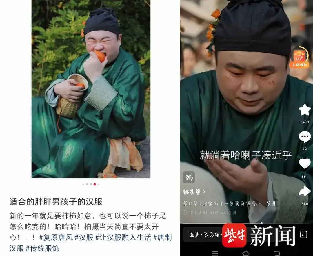 该网友在社交平台发布对比图称,AI短剧《桃花簪》中某男性角色的外貌身形、发型头饰及妆容细节,与其自主搭配、家人拍摄的汉服写真高度重合,几乎是直接“复刻”。更令其愤怒的是,剧中对该角色的台词描述充满恶意:“他身材短小粗胖,平日里游手好闲还好色,看见个女的,眼珠子就黏在了人家身上,浑身上下透着龌龊”,形象猥琐,令人反感。