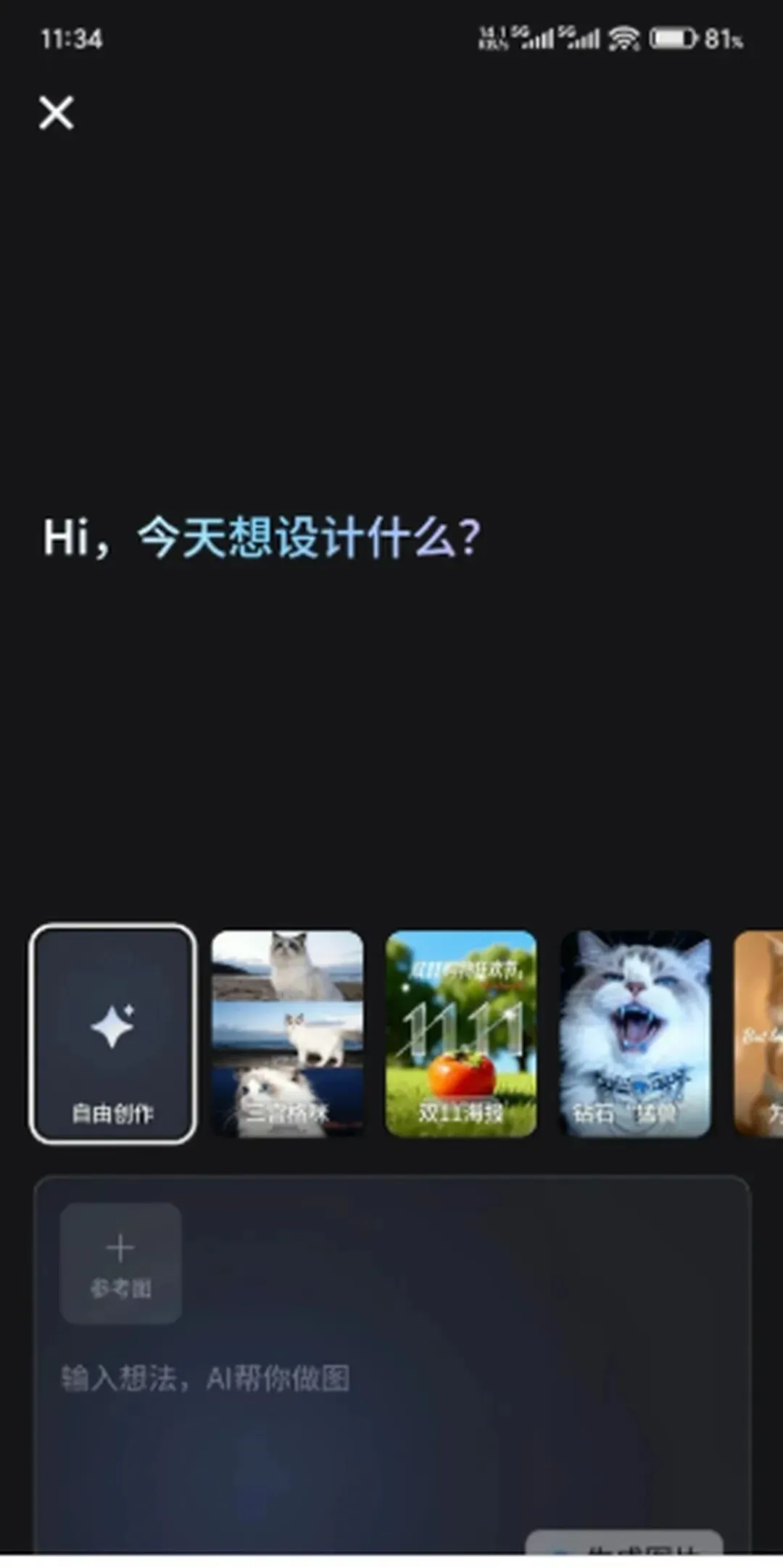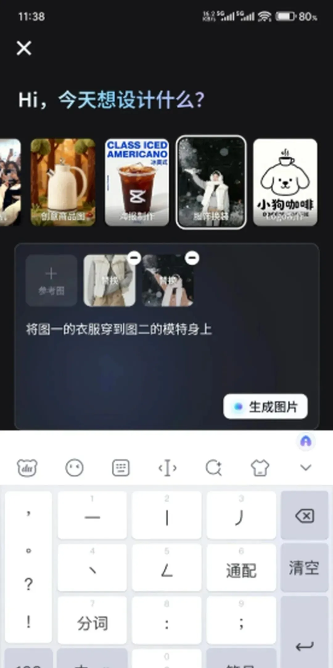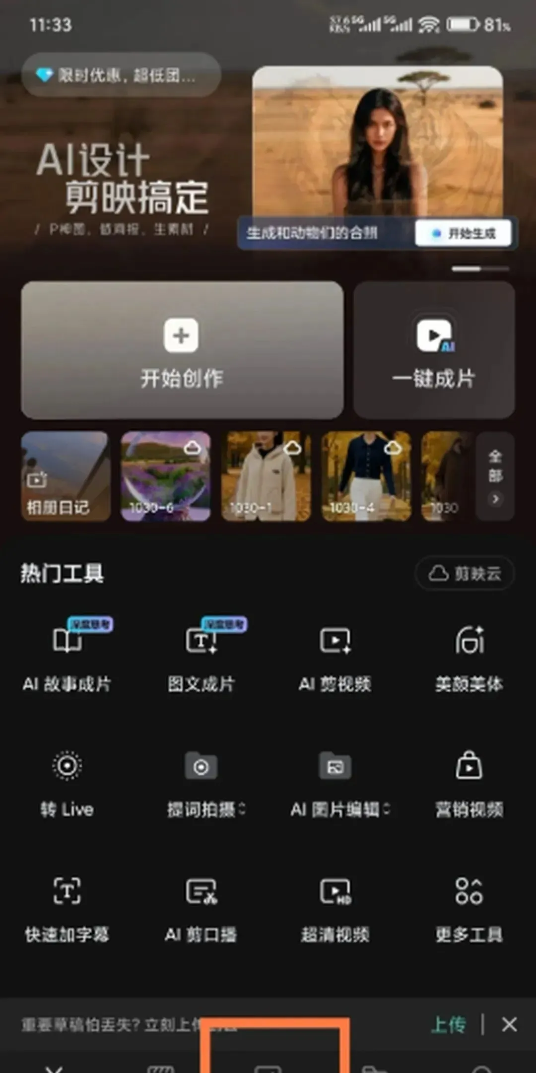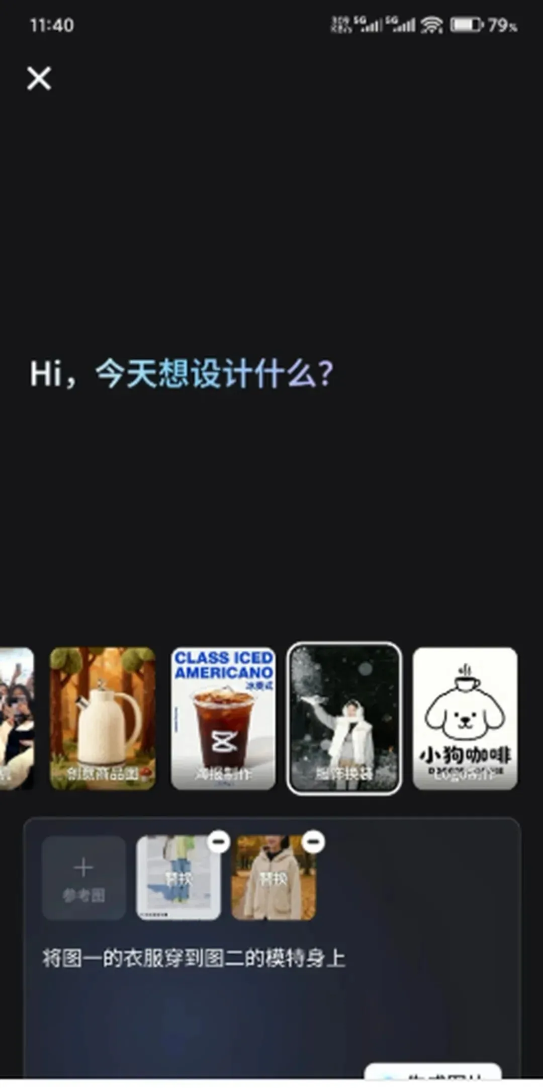 打开剪映,直奔底部菜单的「图片设计」,在宣传图区域随便点一下,就闯进了AI创作基地。这里摆满了现成模板,懒人直接套用就行。不过咱们今天重点聊「服饰换装」,你得往右滑到底,看见那个穿衣图标没?点它!