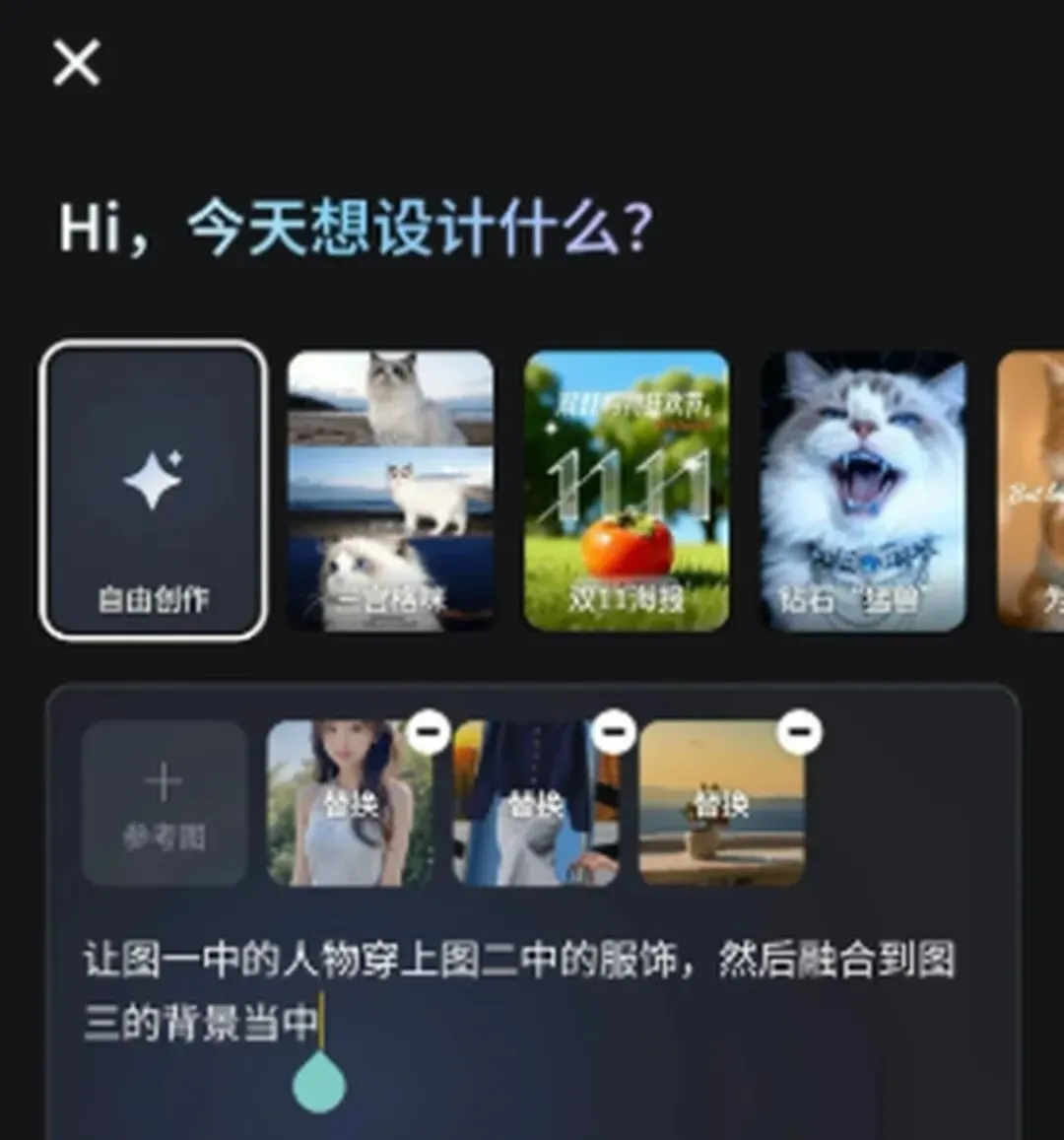 但如果你是个细节控,不妨试试「自由创作」模式。这里你能自由搭配人物、服装、背景三件套,还能在输入框里对AI“喊话”:“让图一的小姐姐穿上图二的西装,站到图三的巴黎铁塔前!”简直像在使唤私人设计师!