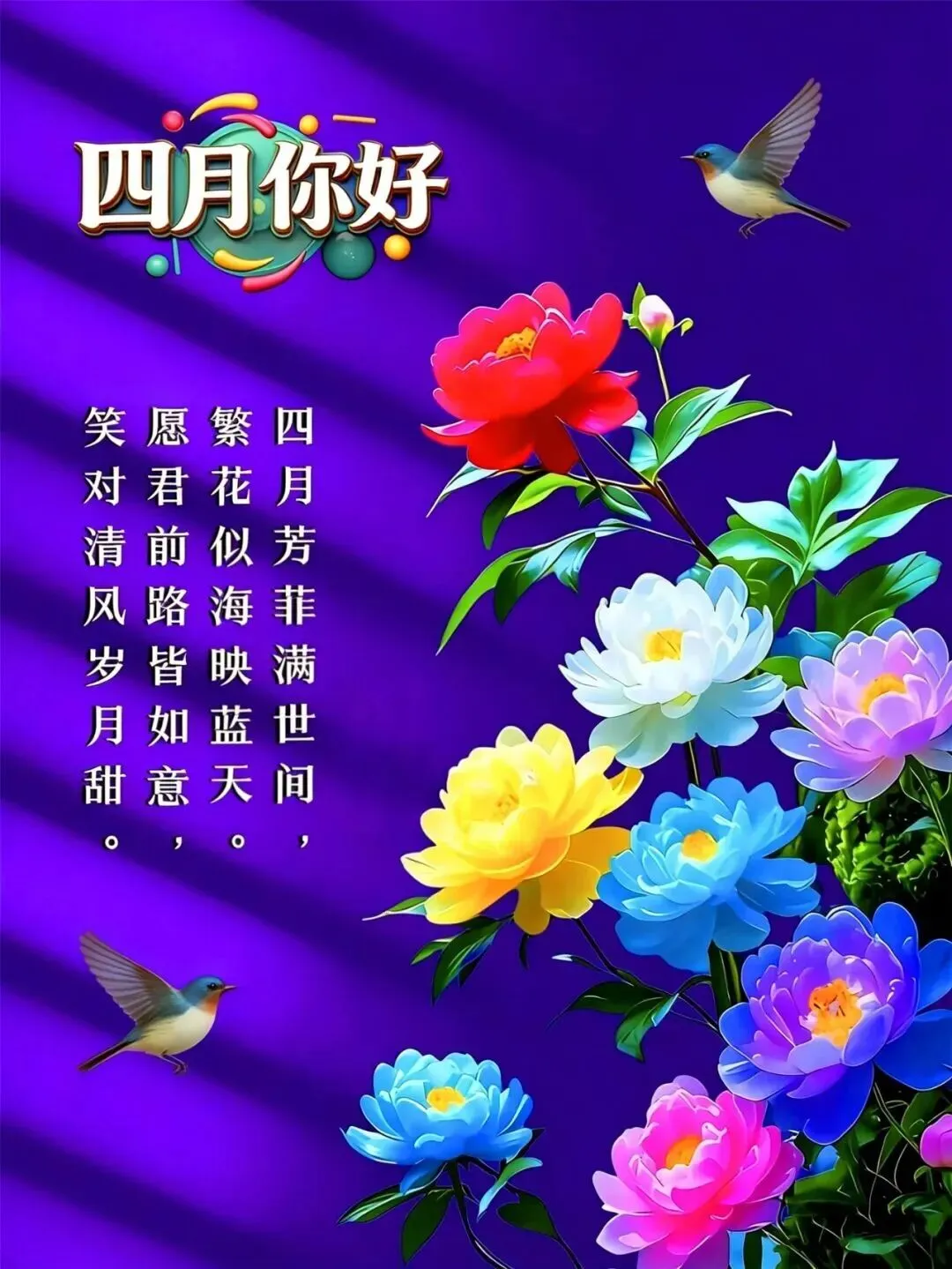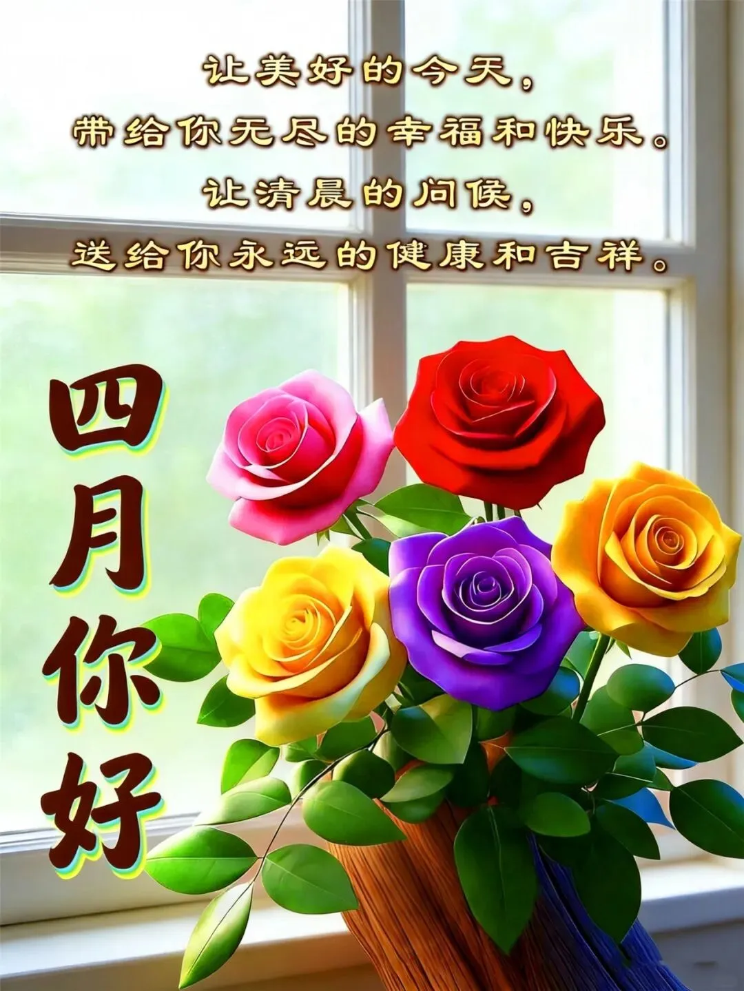 四月你好,春风和煦,阳光温暖,花开时节,不负春光,不负韶华。最美人间四月天,让我们迎接美好四月的到来!早安!