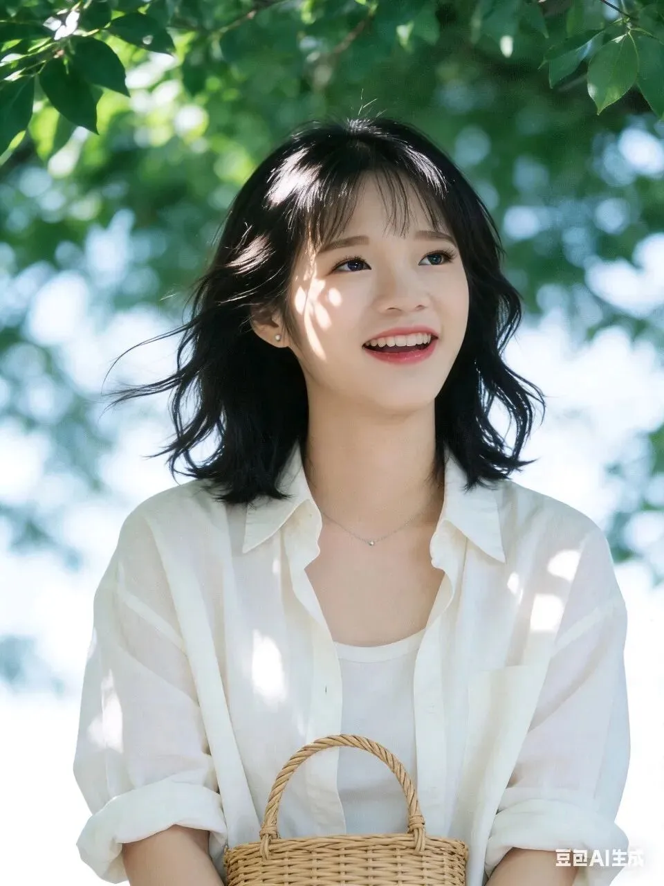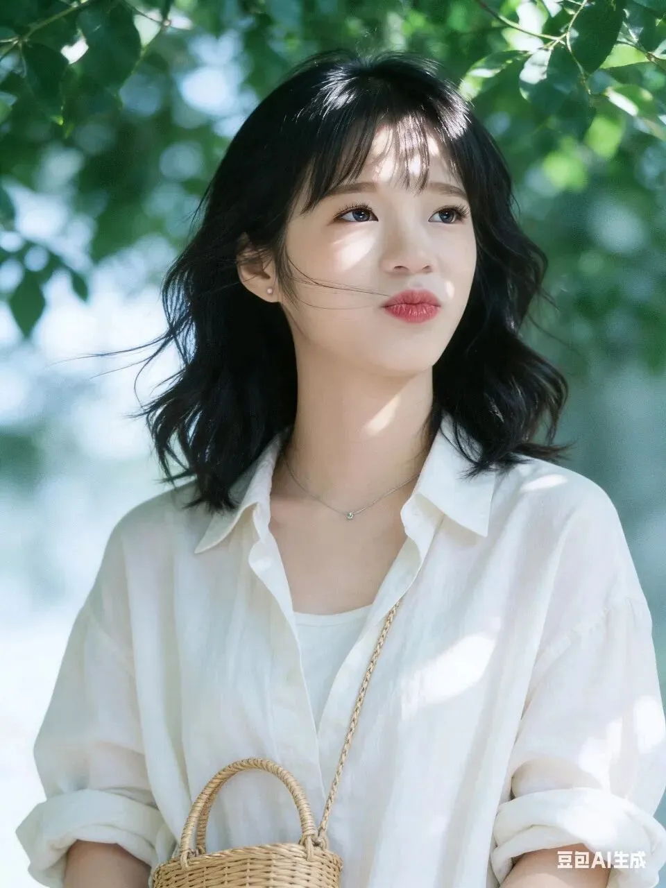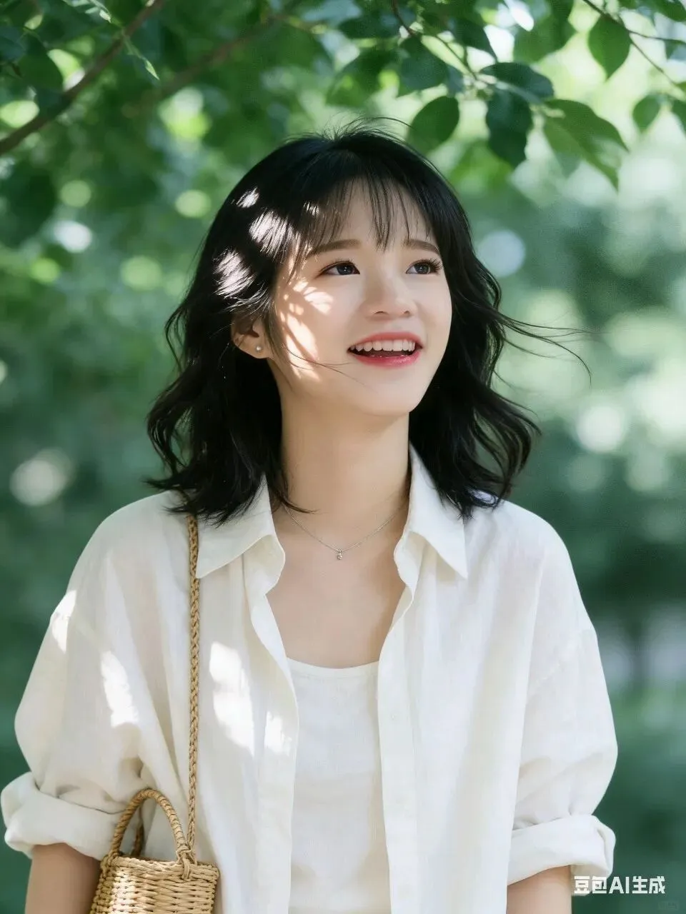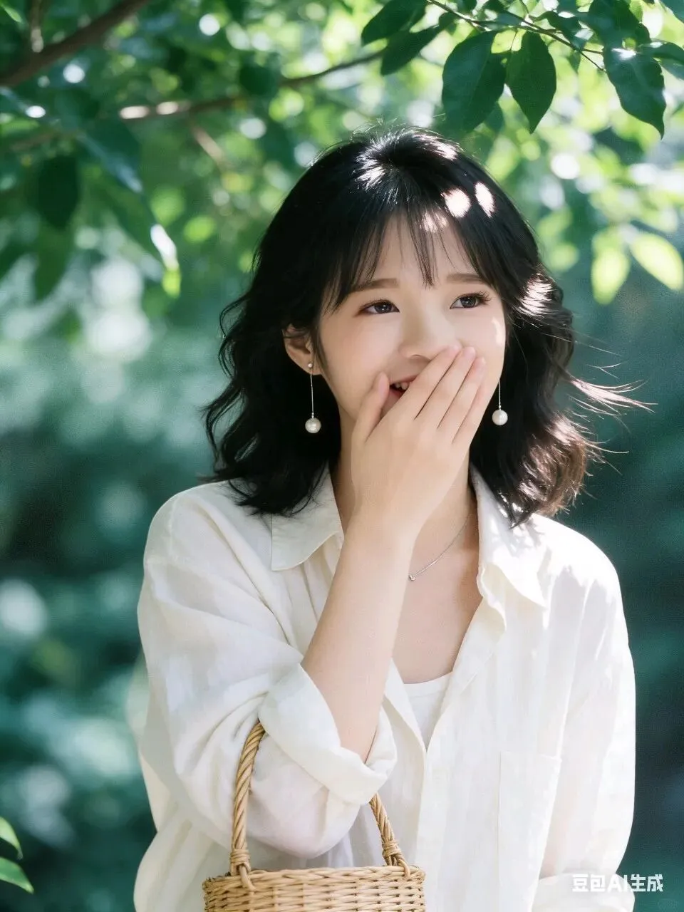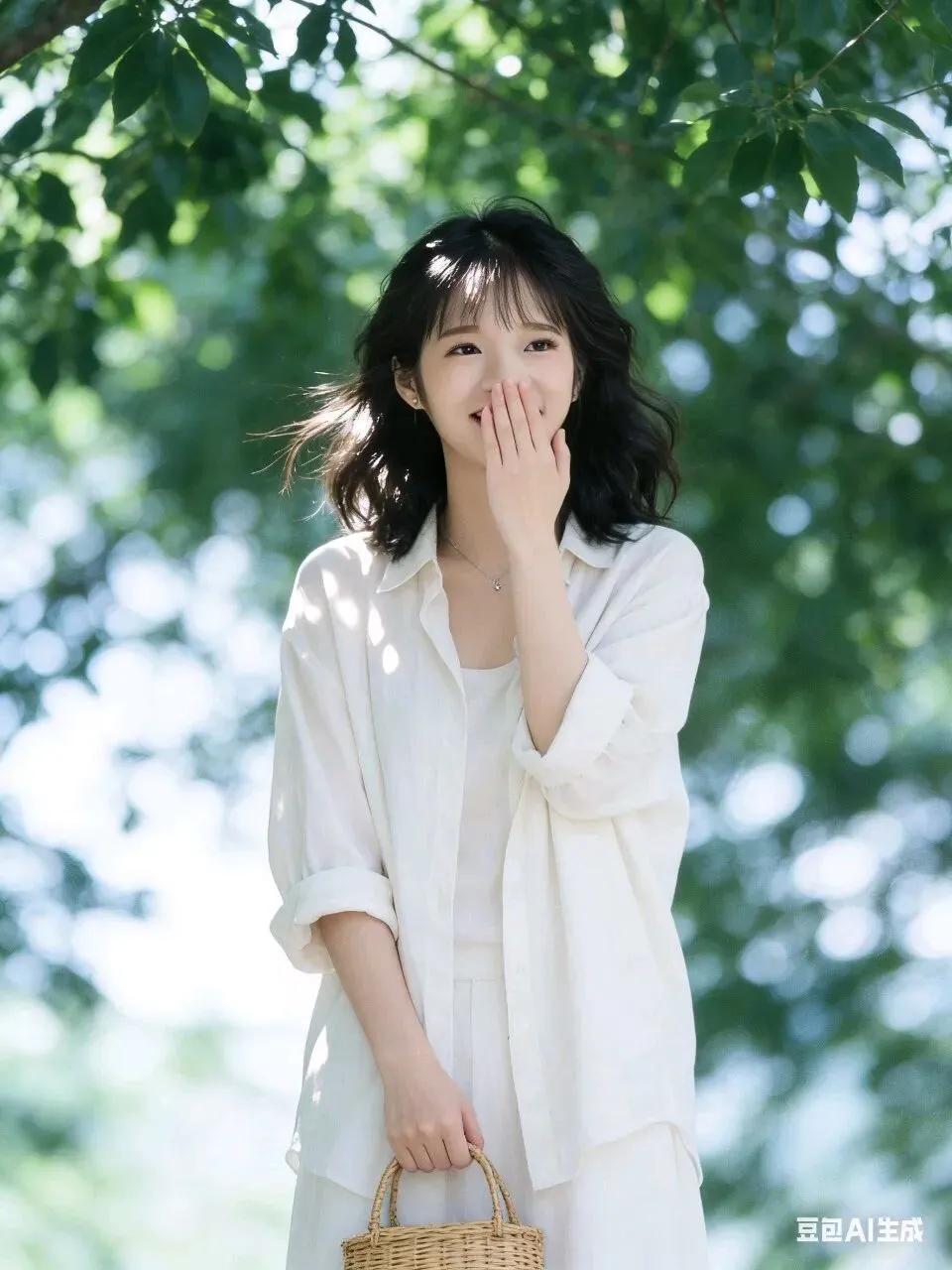 人物保留原生五官,黑色中长发轻盈灵动,伪素颜妆感干净清透,米白色宽松衬衫尽显松弛感,搭配藤编包、细银项链的小细节,温柔又随性。娇羞捂嘴笑、开心大笑、温柔浅笑、俏皮放空的表情,自然不僵硬,夏日绿意背景虚化处理,突出人物主体,没有过度修图和夸张滤镜,保留最本真的自然美感,每一张都想设成壁纸!