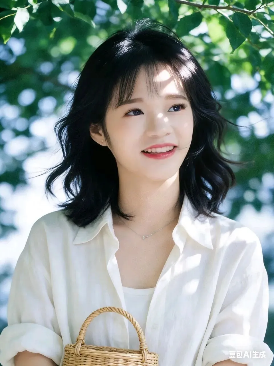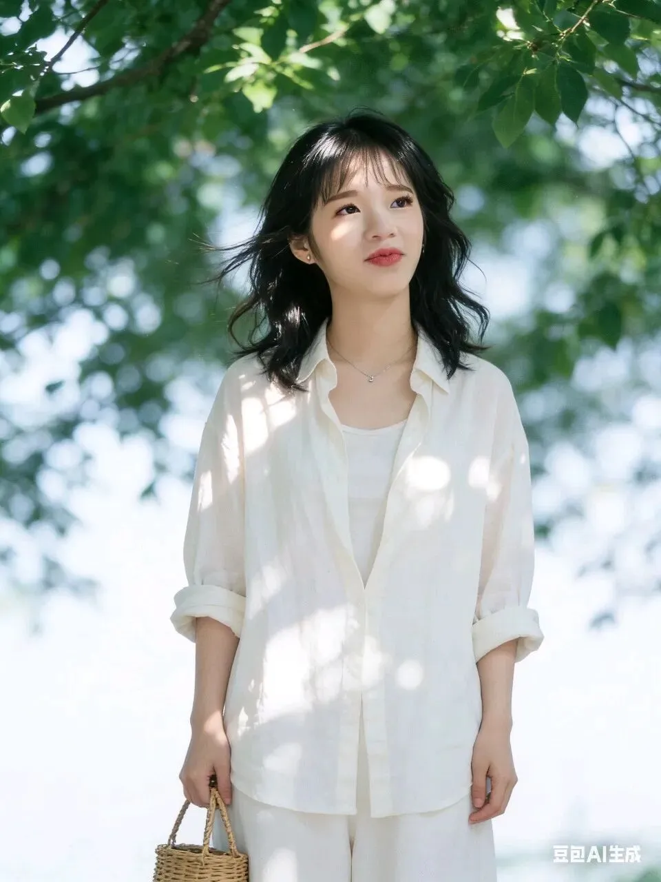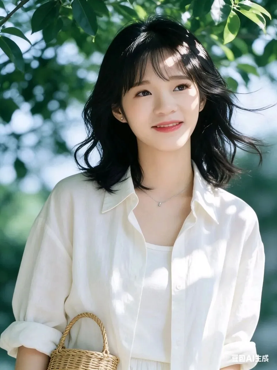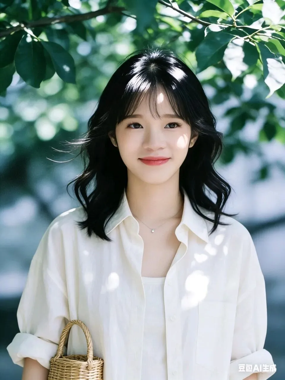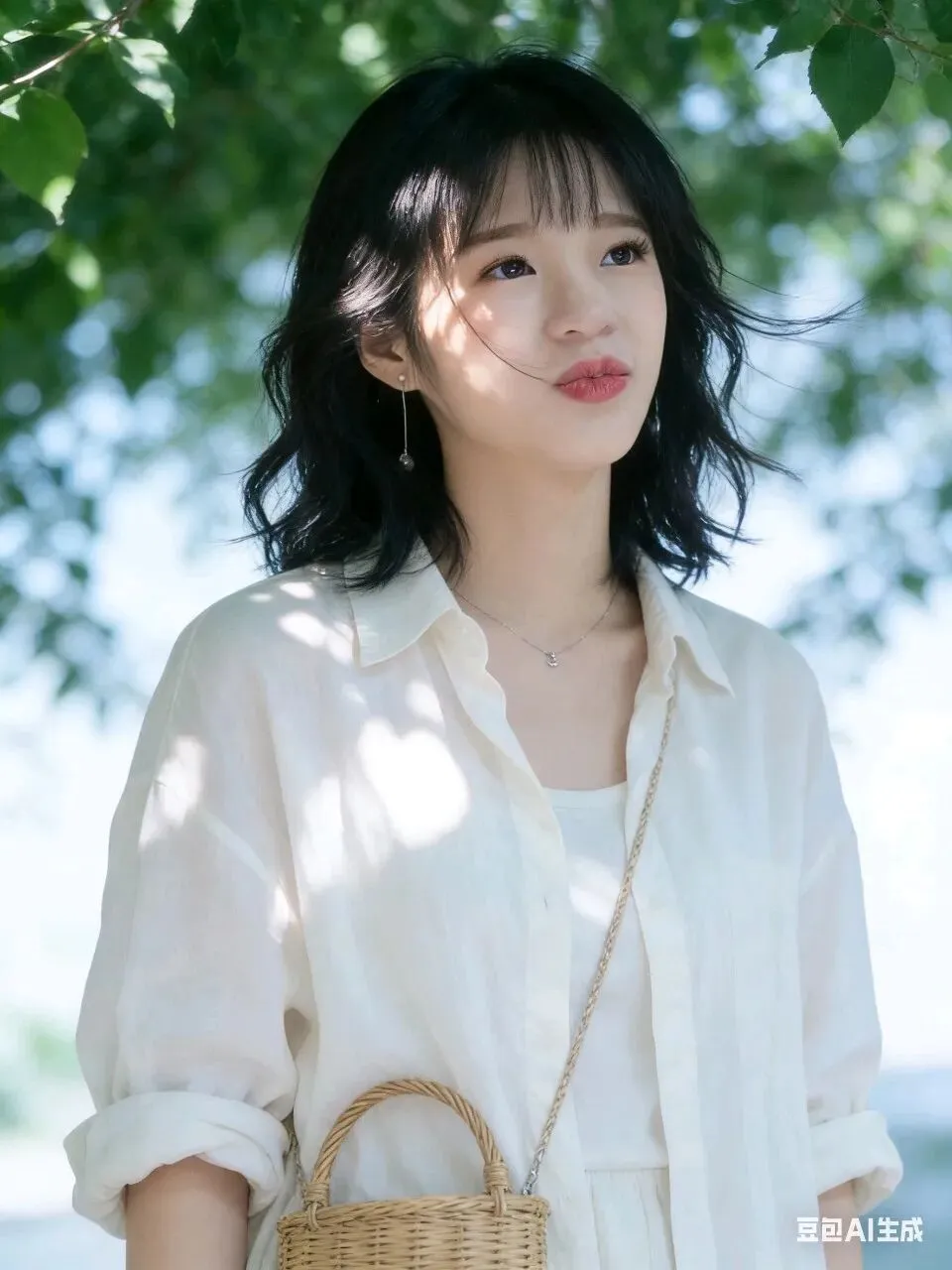 人物保留原生五官,黑色中长发轻盈灵动,伪素颜妆感干净清透,米白色宽松衬衫尽显松弛感,搭配藤编包、细银项链的小细节,温柔又随性。娇羞捂嘴笑、开心大笑、温柔浅笑、俏皮放空的表情,自然不僵硬,夏日绿意背景虚化处理,突出人物主体,没有过度修图和夸张滤镜,保留最本真的自然美感,每一张都想设成壁纸!
