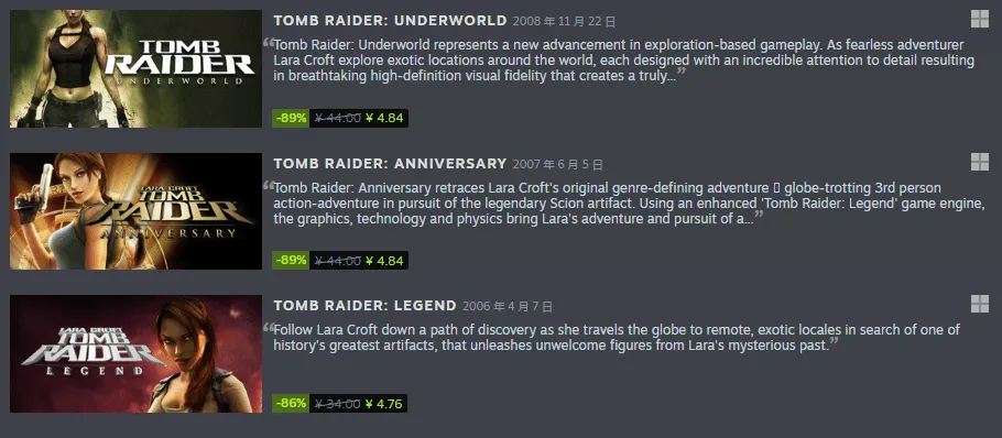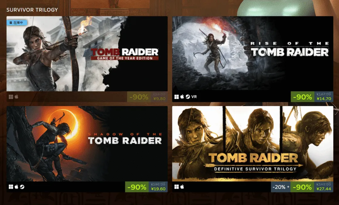 不过,新作虽然好,对于大多数玩家来说,眼下的实惠或许才是真理。Steam现已同步开启《古墓丽影》系列特卖,折扣力度高达90%,感兴趣的社友别错过了。