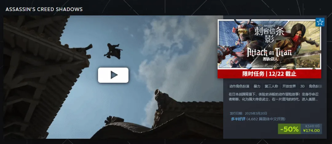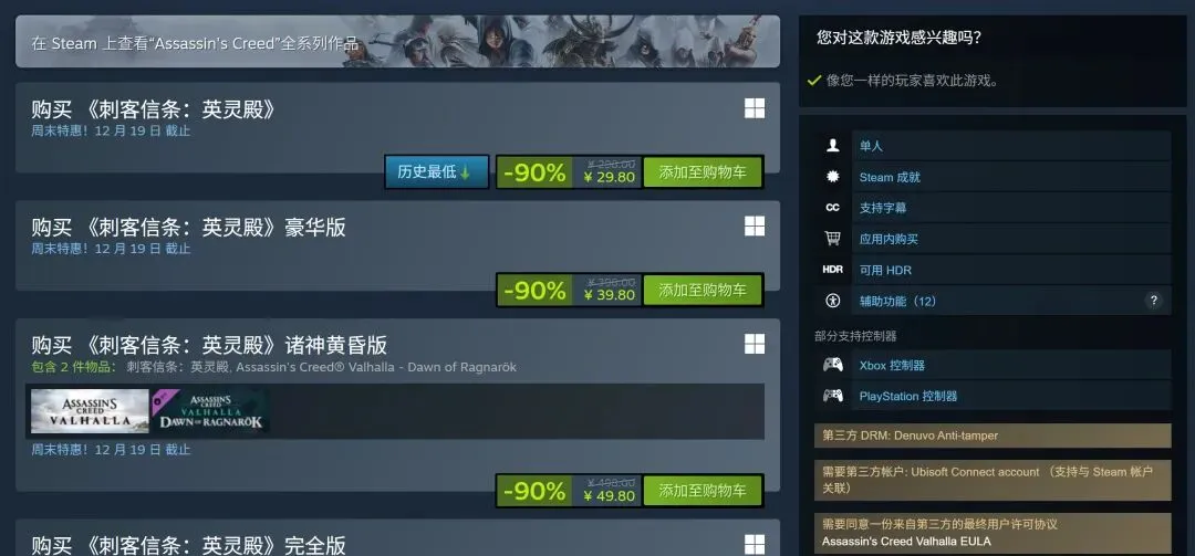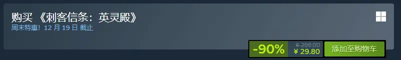 《刺客信条:英灵殿》在Steam开启周末特惠促销,该作标准版原价298元,现降价90%,当前仅售29.8元,为新史低。豪华版原价398元,同样1折促销,当前仅售39.8元。本次周末特惠截止12月19日。