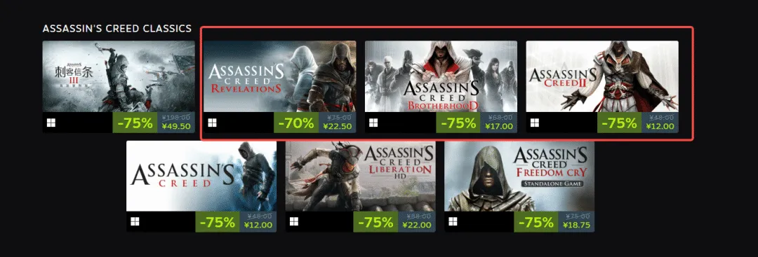 作为《刺客信条》系列的绝对经典,质量有保障,非常推荐此前没有接触过该系列的朋友体验。三部曲分别为《刺客信条2》、《刺客信条:兄弟会》和《刺客信条:启示录》,折扣在70%-75%之间,均为史低售价。