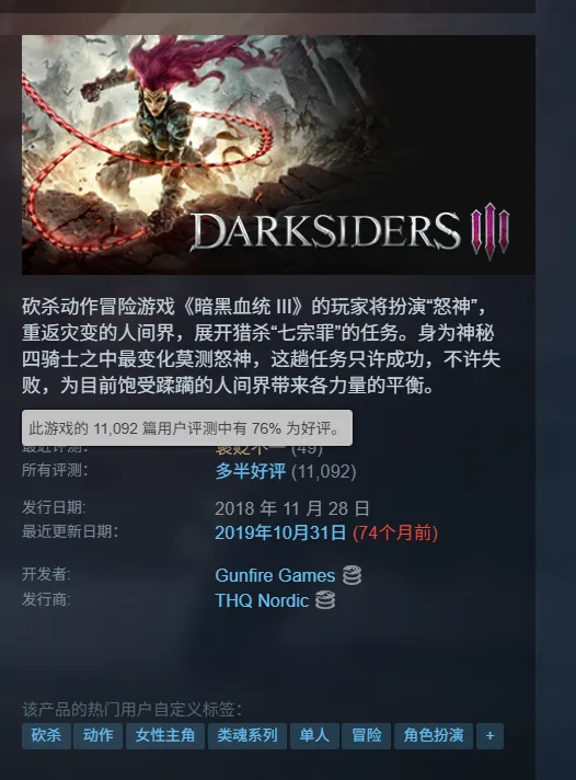 截稿之前,《暗黑血统3》在Steam平台全部评测为“多半好评”,11092条用户测评中,好评率为76%。