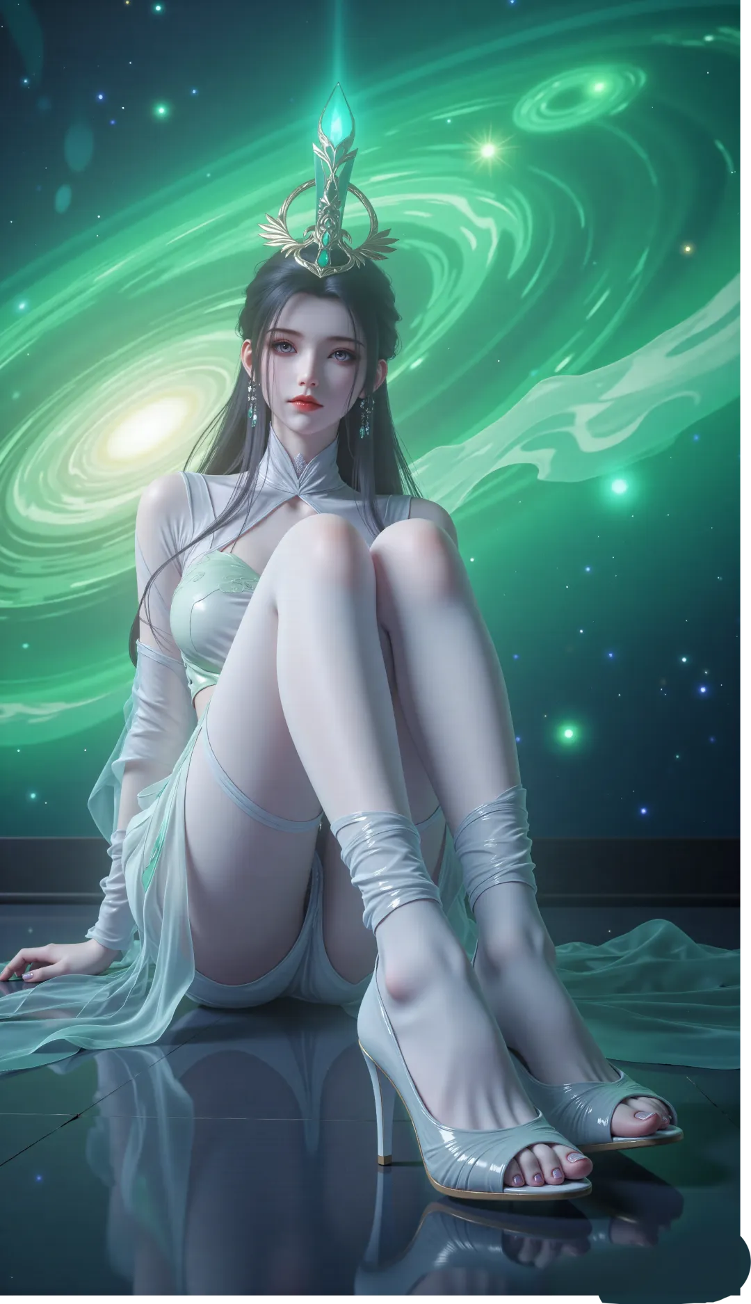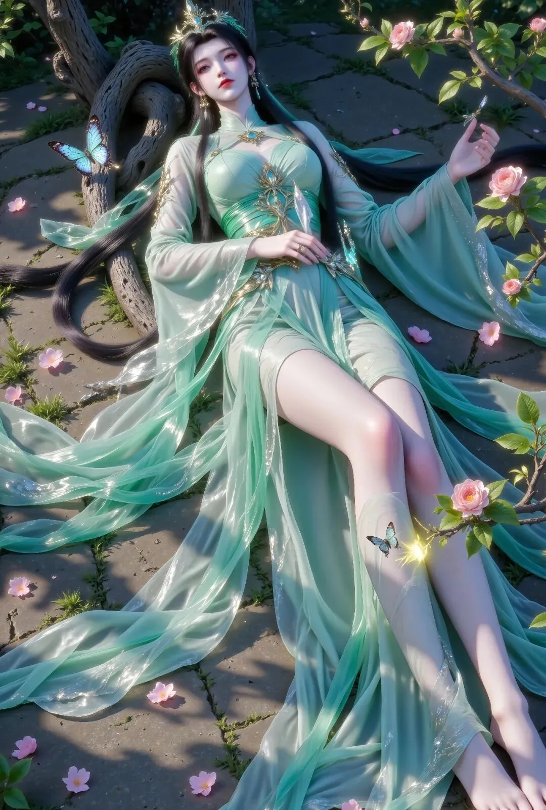 她的长发乌黑柔顺,如瀑布般散落在地面,发间佩戴着精致的金色与青绿色相间的头冠,额前点缀着一枚红色花钿,增添了几分古典韵味。