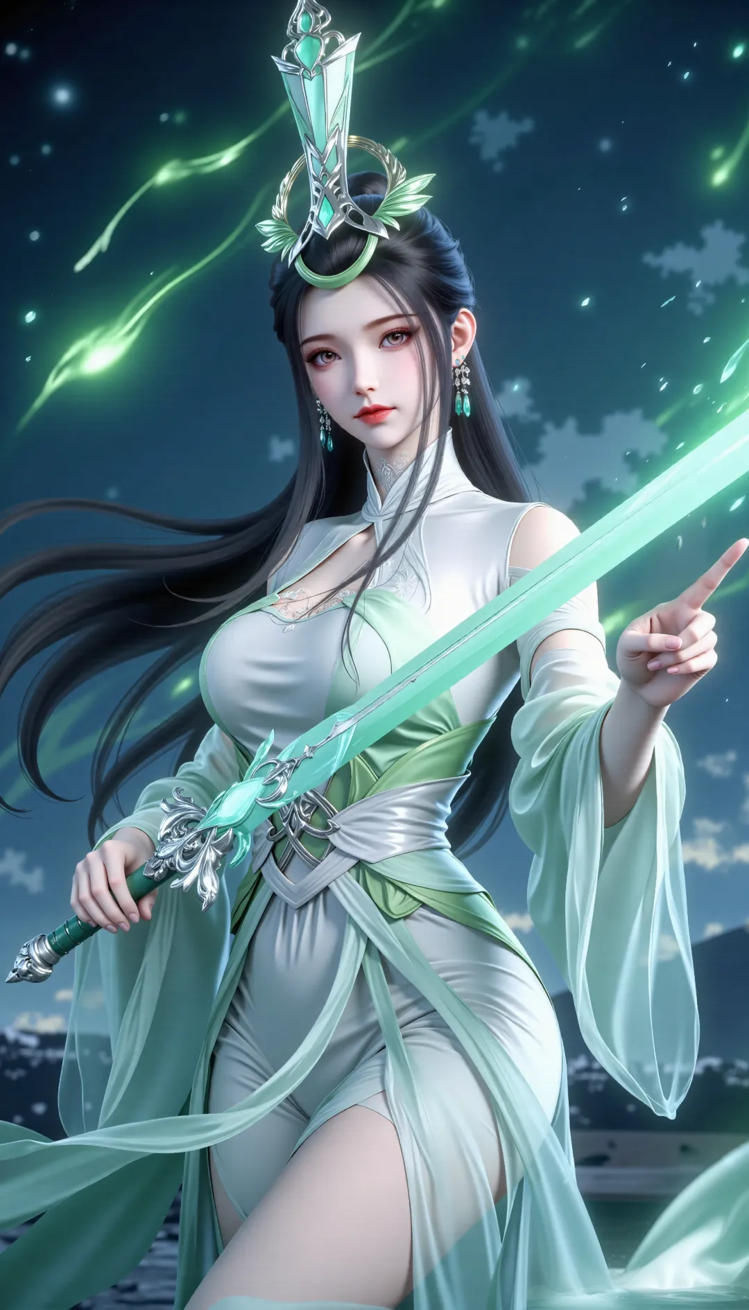 陆嫁嫁身着一袭飘逸的浅青绿色古风长裙,衣料轻薄透明,如云雾般环绕周身,裙摆与袖口随风舒展,极具流动感。