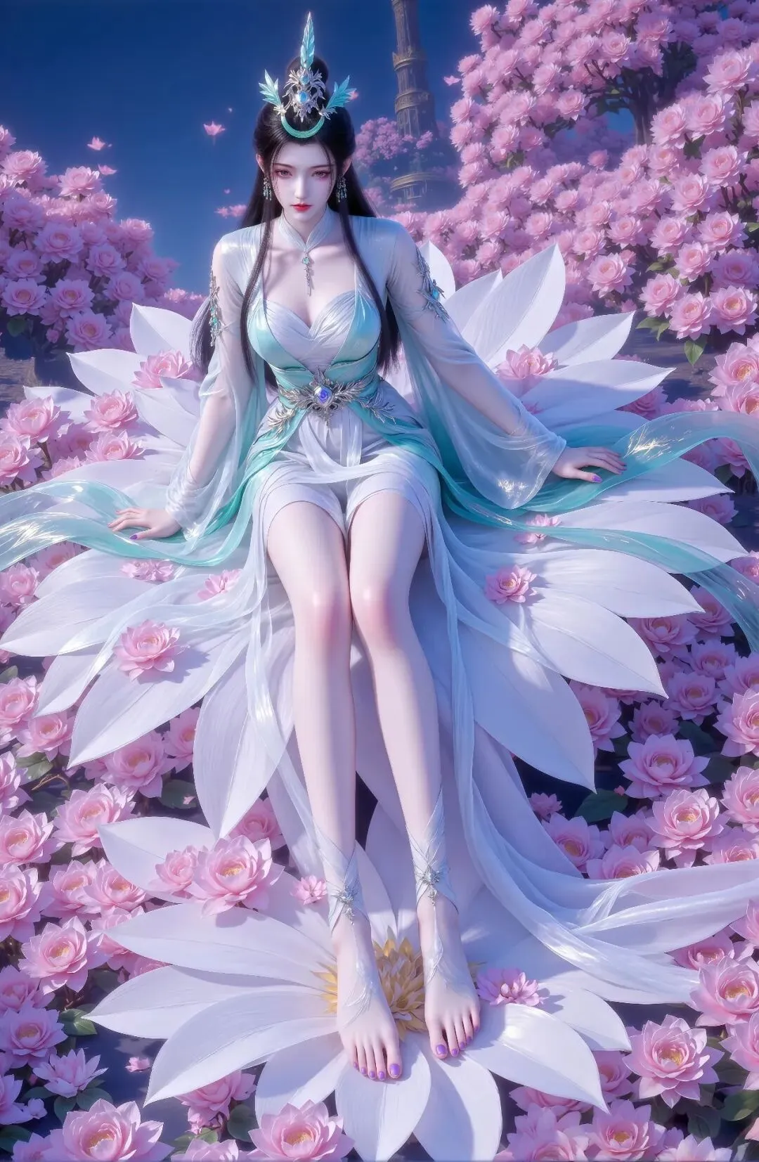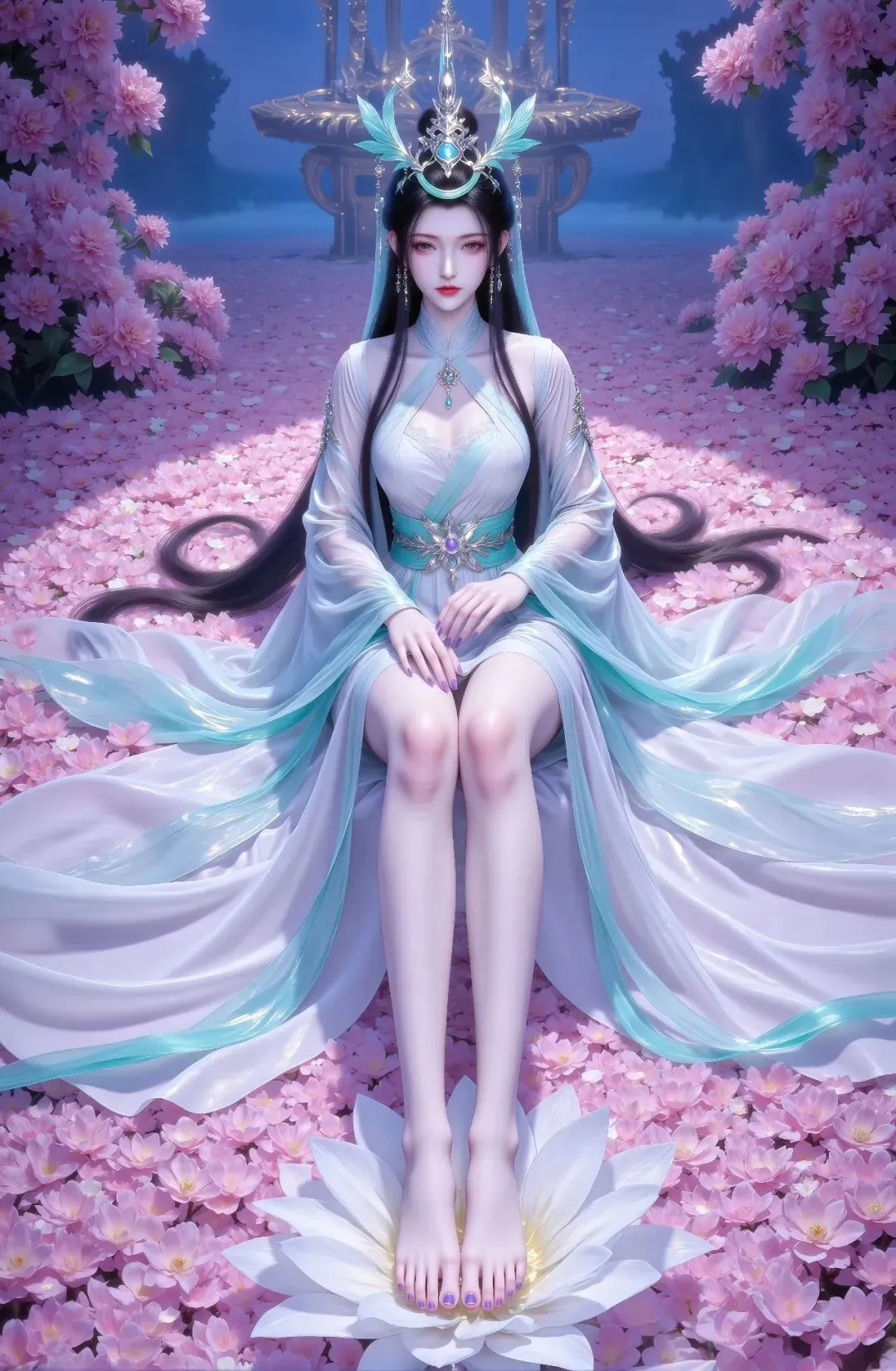 她坐于一片粉色花海之中——地面铺满层层叠叠的粉色花瓣,前方正中央有一朵巨大的白色莲花,她双足轻踏其上,莲花的纯净与花海的柔美形成视觉焦点。