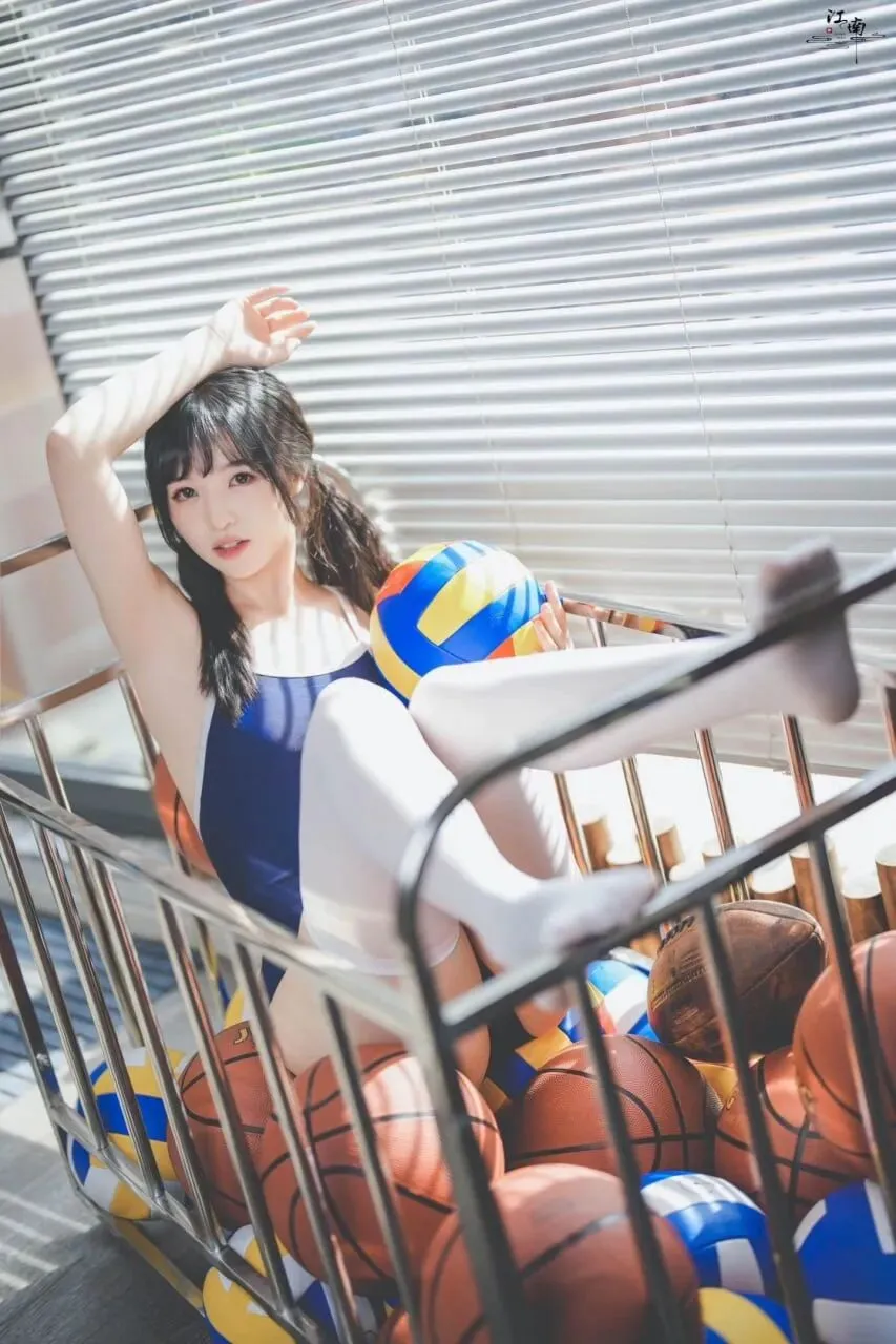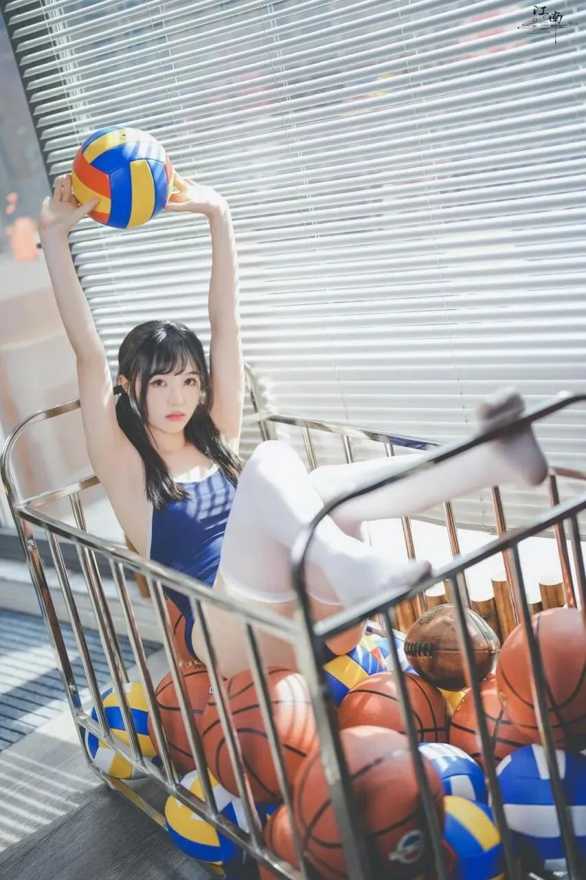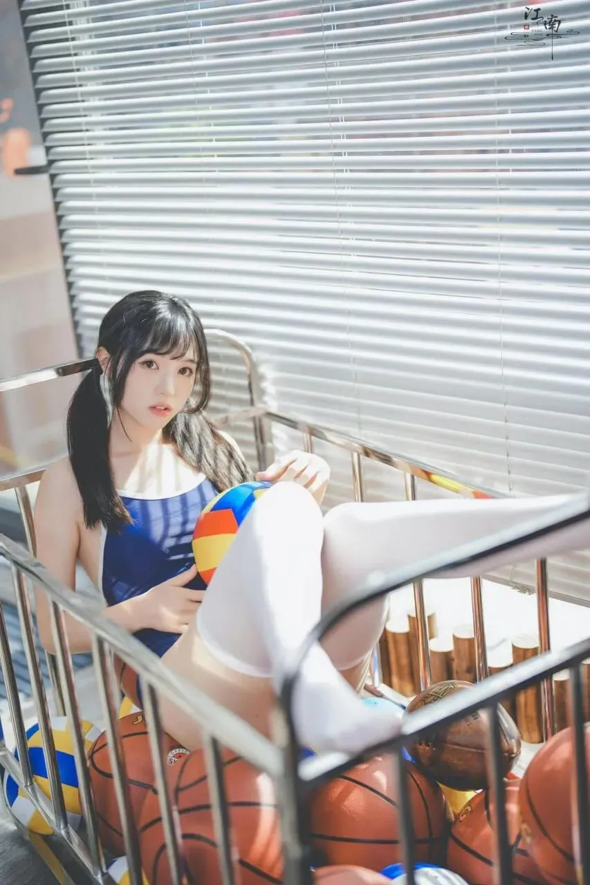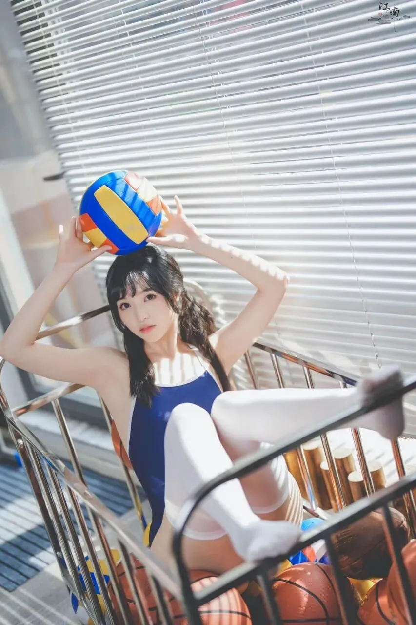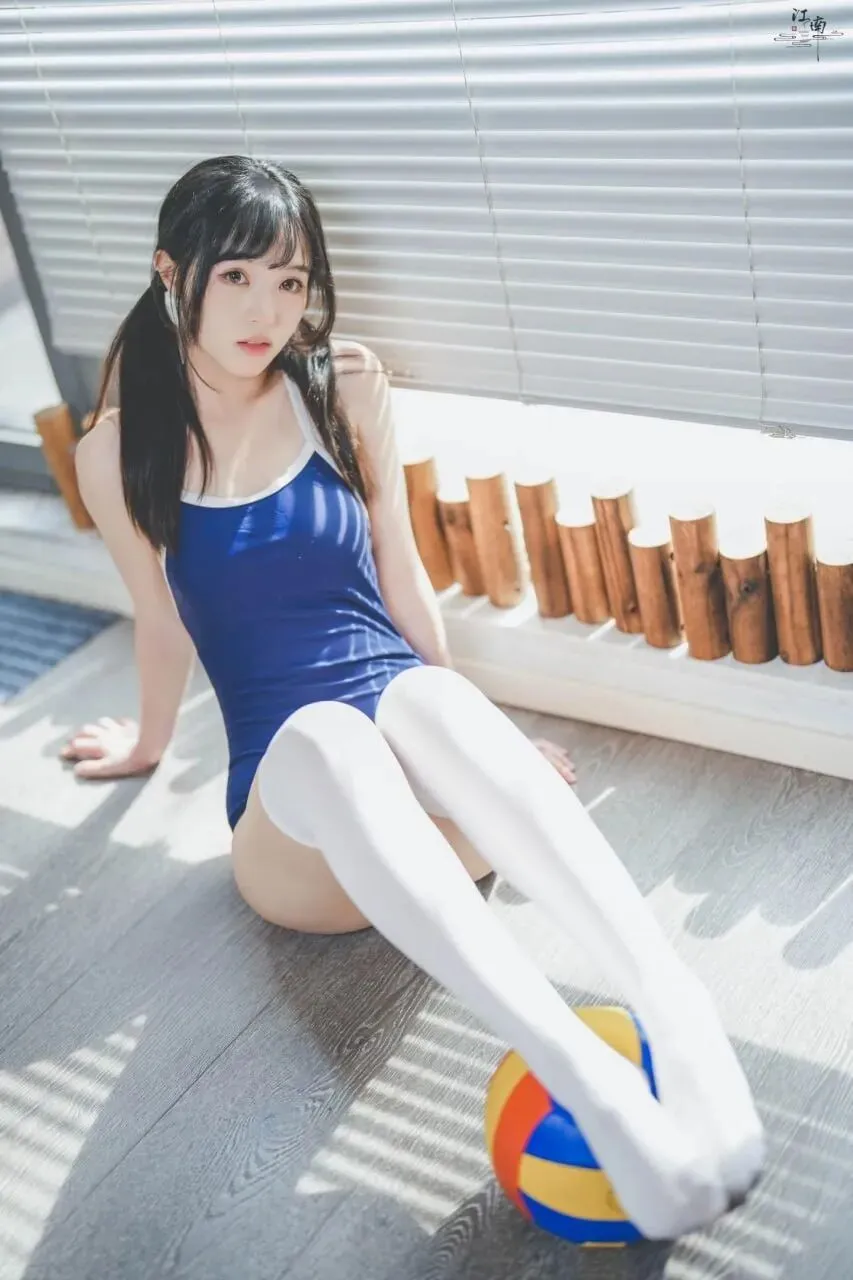 纯欲少女穿搭范本|深蓝泳衣*白色过膝袜,抱球而坐的纯欲少女感