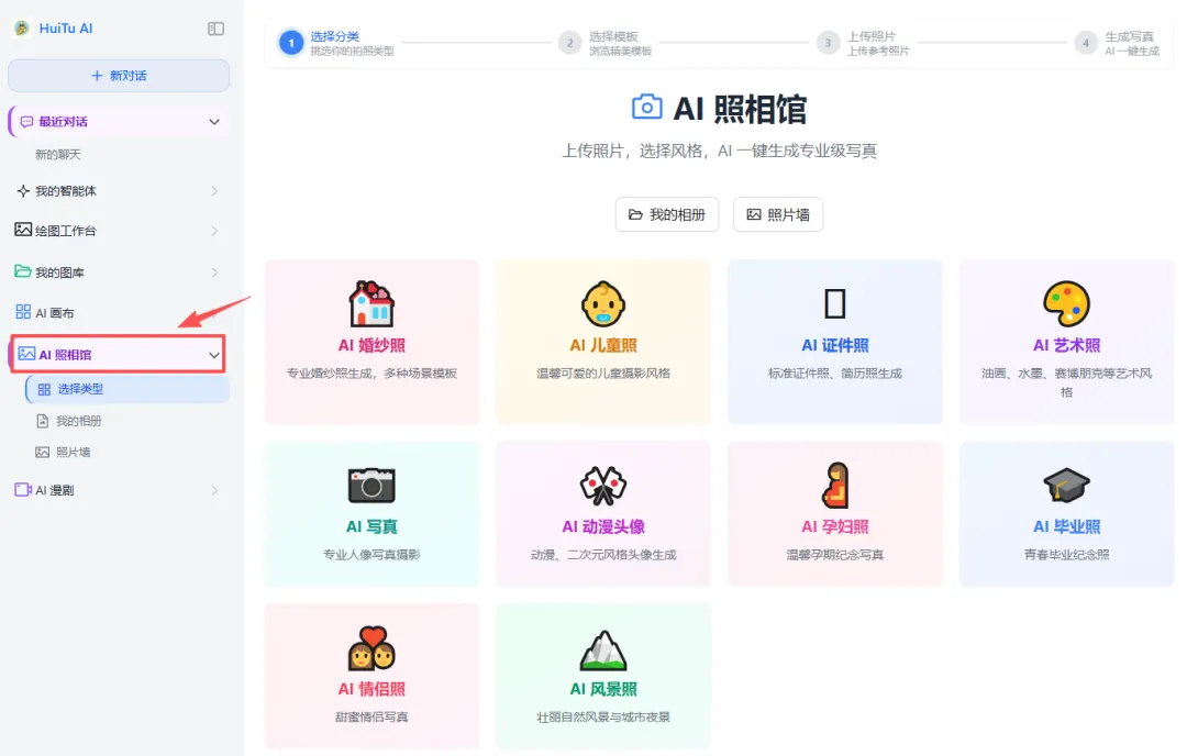 我最近体验到一款超牛的 AI 照相馆叫做 HuiTu AI ,只需要上传照片,AI就能自动生成多种风格的写真大片。