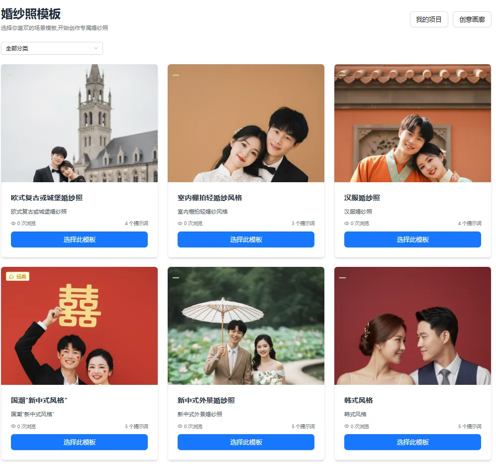 从右侧菜单栏点击AI 婚纱照,先选择模板,这里提供了多个模板供大家任意选择。