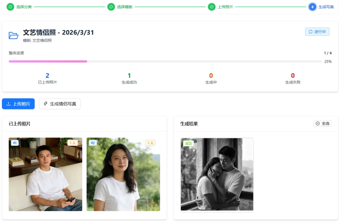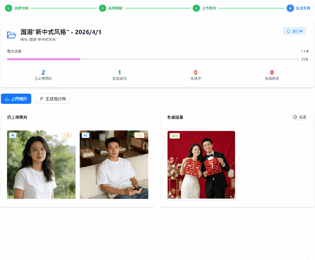 选择模板后上传照片,点击生成照片稍等一会就可以看到完美的结婚照了。
