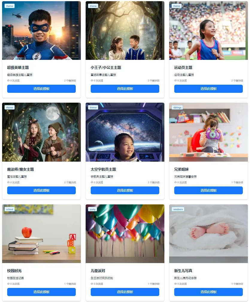 第一步同样打开这个网址,然后从右侧点击AI 儿童照,先选择模板,这里依然有多个模板供大家任意选择。