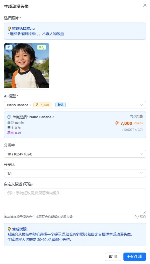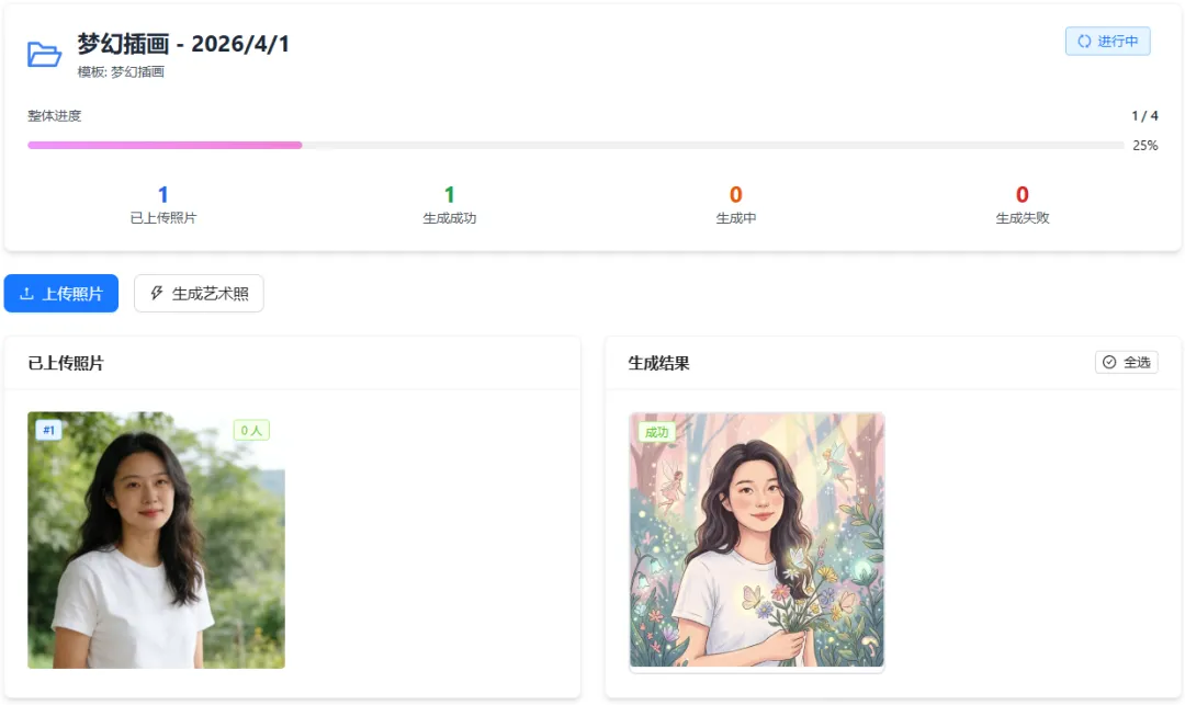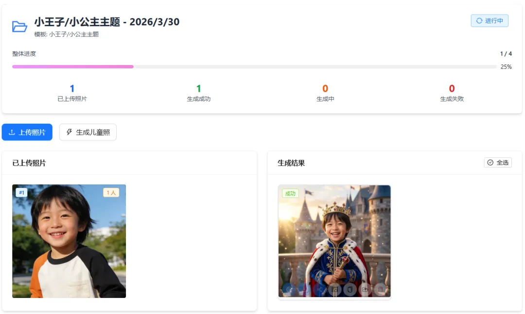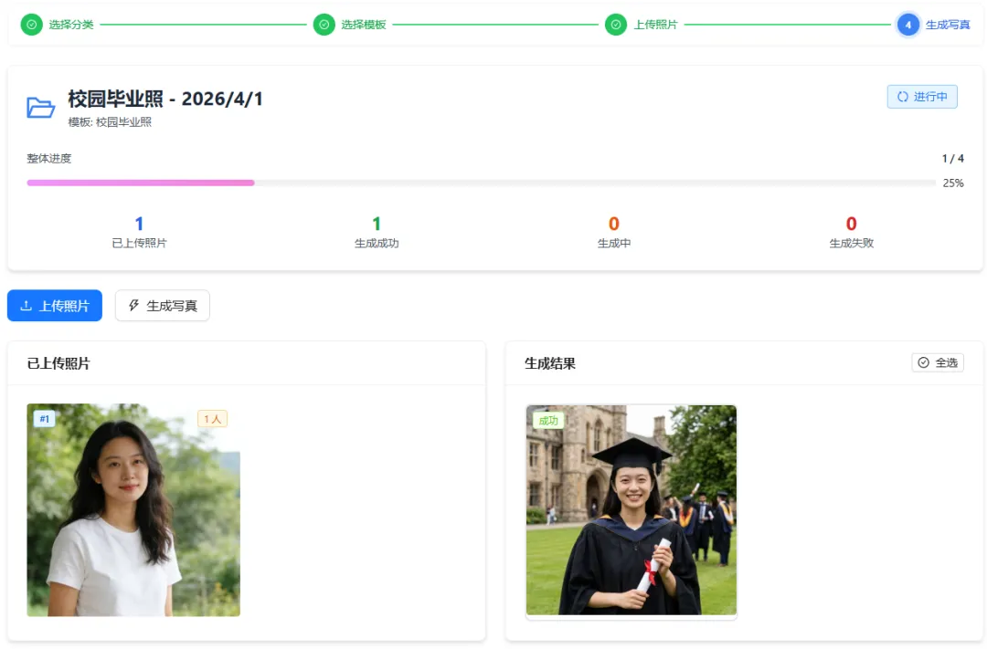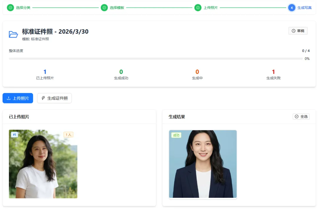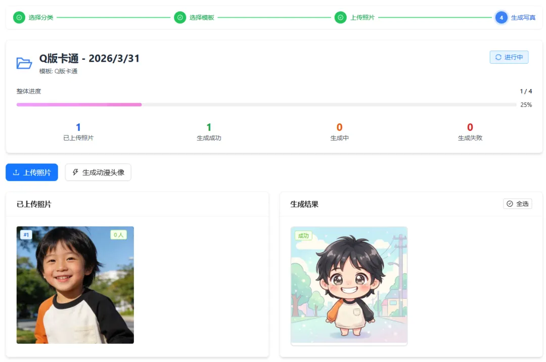 选择模板后上传照片,点击生成照片稍等一会就可以看到了。