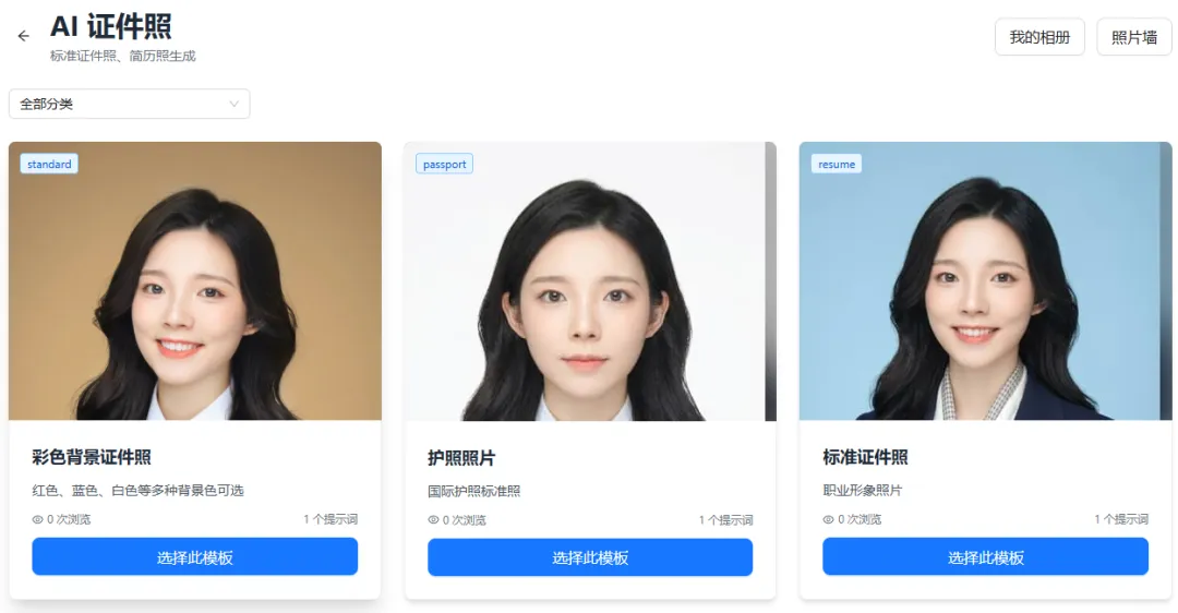 打开上面的网址,找到AI证件照,里面有彩色背景证件照、护照照片、标准证件照。