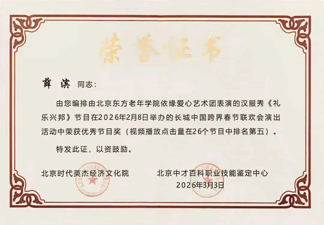 近日,北京东方老年研修学院传来喜讯。由学院模特班学员组成的依缘爱心艺术团,在2026年2月8日举办的长城中国跨界春节联欢会上,凭借汉服秀《礼乐兴邦》的精彩演绎,荣获优秀节目奖。