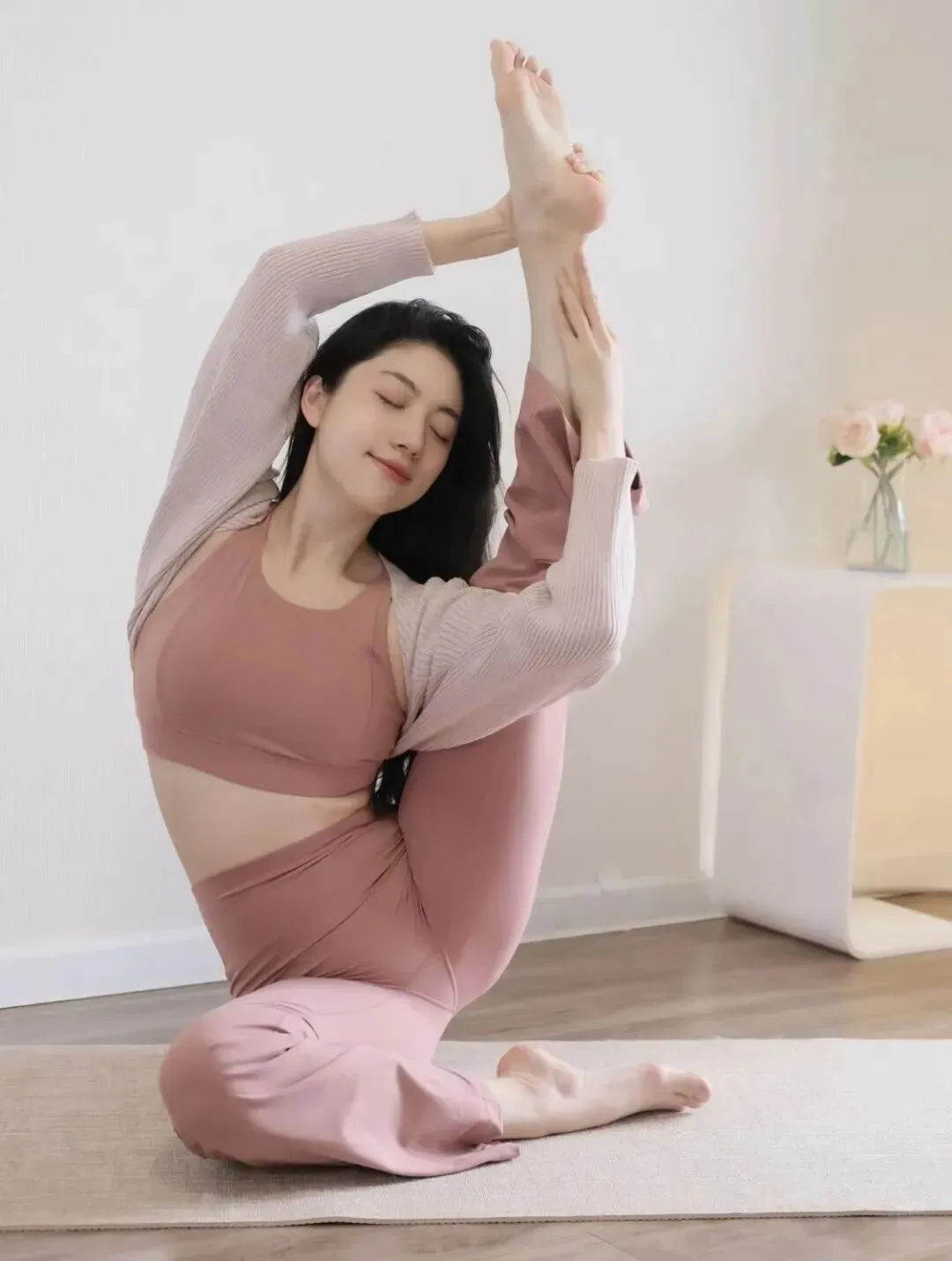 第一个动作是坐姿拉伸。坐在瑜伽垫上,将一条腿向上延伸,双手轻轻握住脚踝。注意不要为了追求高度而紧绷肩膀,闭上眼享受拉伸的感觉,下巴微收,这样能勾勒出清晰的下颌线。这个动作非常显腿长,视觉上拉长了全身比例,同时展现出身体的柔韧美。