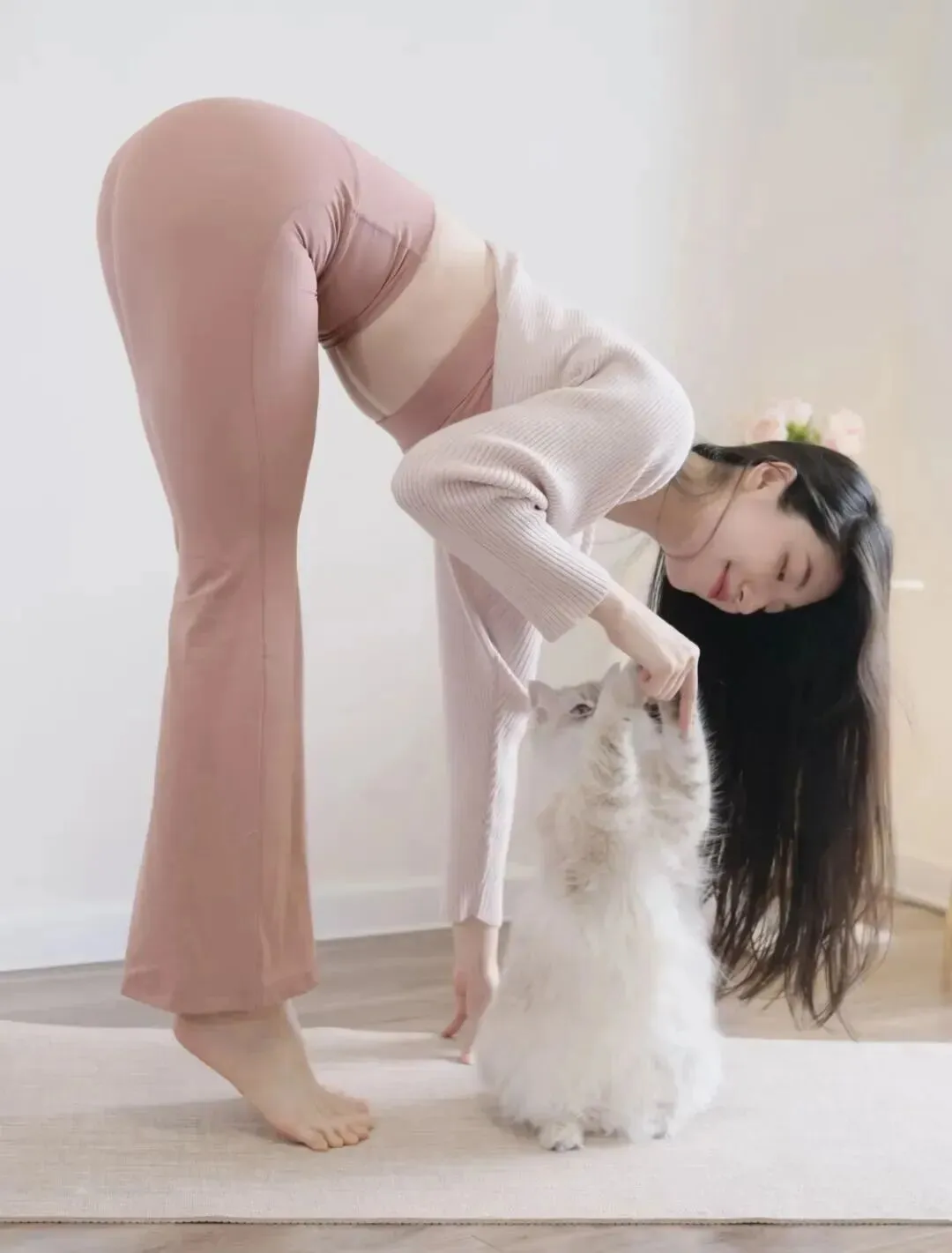 第二个动作可以借助家里的宠物。做站立前屈时,让头发自然垂落,不要遮脸,手轻轻触碰地面或脚踝。这时候如果猫咪走过来,顺势摸摸它,眼神看向宠物,画面瞬间就有了故事感,温馨又生动,完全不用看镜头也能很自然,互动感是居家写真的灵魂。