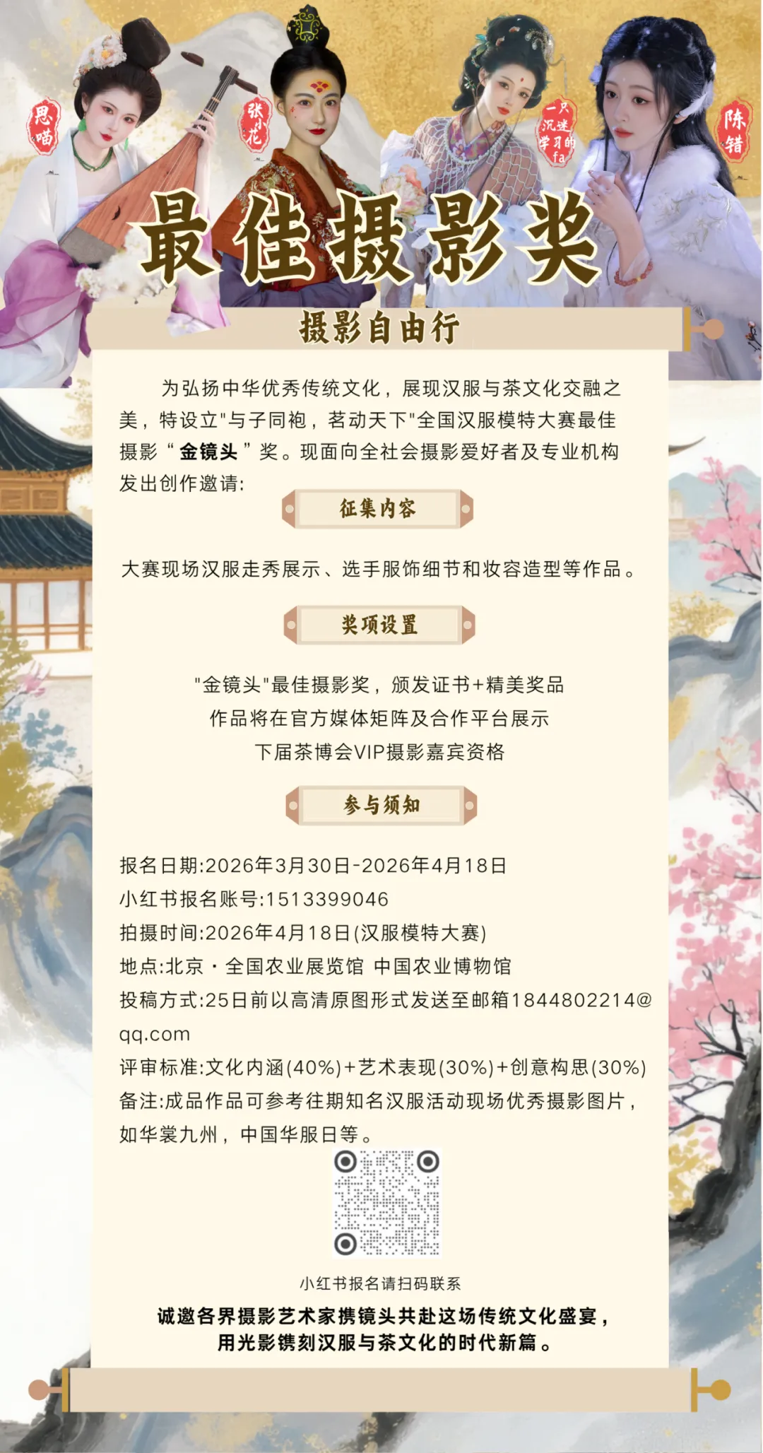 2026年与子同袍·茗动天下全国汉服模特大赛——十二花神国风品牌大秀,即将在北京举行。为了鼓励更多摄影爱好者投身国风创作,特设立了最佳摄影“金镜头”奖,希望能激励拍出更多优质的摄影作品。
