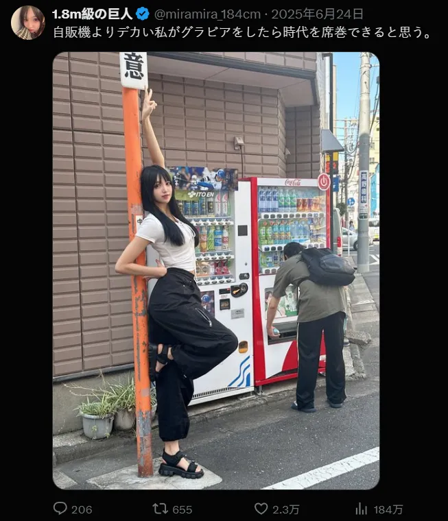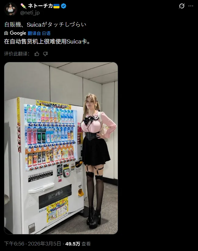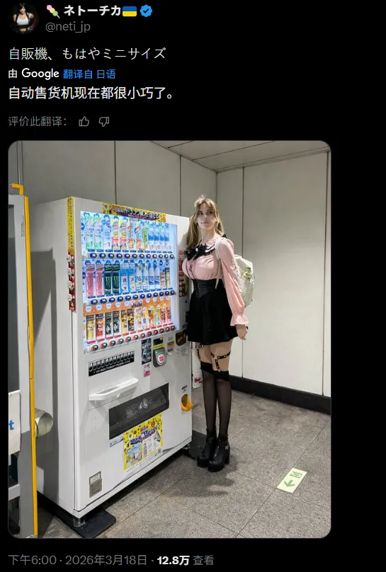 不知道从什么时候开始,"高个子女生站在自动贩卖机旁边"成了日本社交媒体的标配公式。矮一点的机器,高一点的人,一张照片,轻松破万赞。