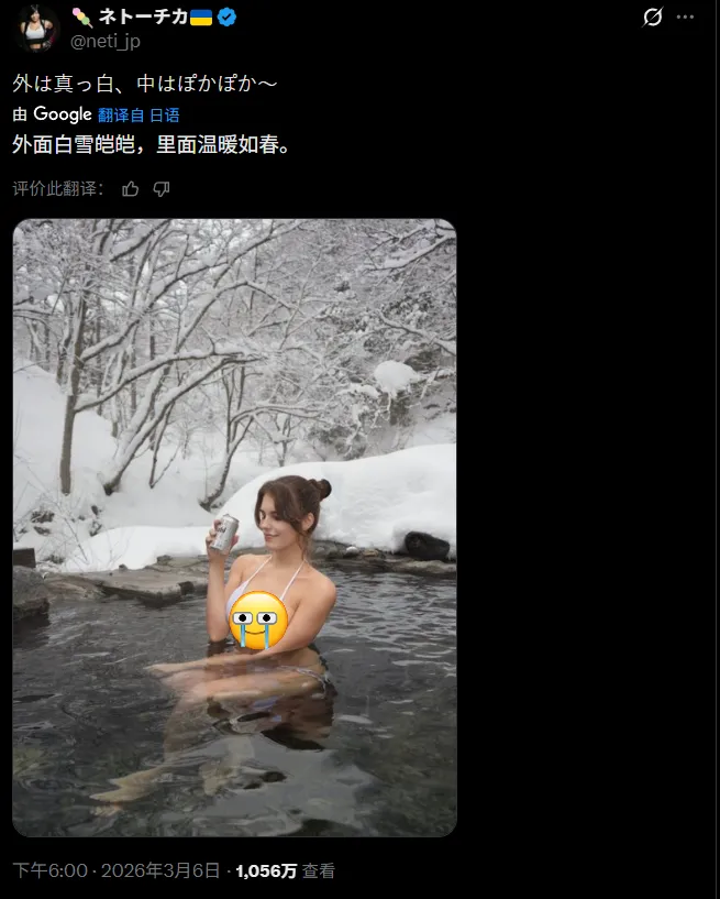 今年3月初,Netochka在社交平台发布了一张图片,场景是雪地中的露天温泉,热气腾腾的,她穿着比基尼,手里拿着一罐饮料,整体呈现出一种反差美学户外冰天雪地,水里暖烘烘的,  人还穿着清凉的装扮。